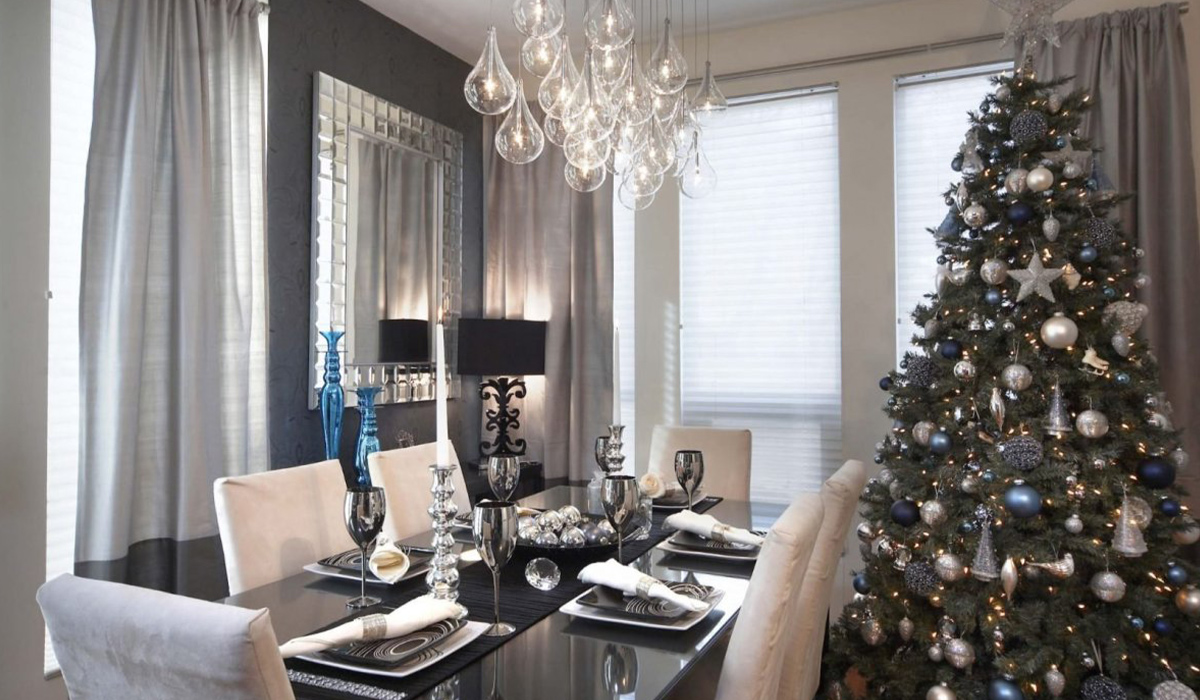 Шарм новорічної вітальні грає сяйвом блискучих поверхонь та прозорих деталей інтер’єру. Натуральні графітові відтінки додають вишуканого стилю, а скляні елементи підкреслюють його розкіш у шпалерах вінілових Sintra Swing UNI 460160. Стілець обідній дерев'яний Родео-8 білий Альфа створює виразний контраст з темною гамою інтер’єру. У сяйві глянцю обіднього стола мерехтить вишуканий набір келихів для вина Luminarc Delice Graphite J9397/2 360 мл 6 шт. Доріжка Прованс Black Milan 40*140 см елегантно оздоблює святкове сервірування і ледь пом’якшує блискучу ідилію посуду. Ялинка Президентська лита 250 см впевнено входить у будь-який сучасний дизайн кімнати, додаючи їй цікавого акценту. Прикраси, серед яких набір ялинкових куль BonaDi 147-887 8 см 12 шт срібного кольору та іграшки на ялинку куля BonaDi 787-483 10 см сині, увиразнюють загальну концепцію кімнати, додають їй краси і грації.