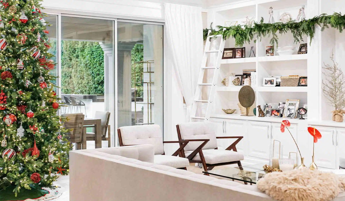 Простора вітальня з терасою гостинно запрошує провести різдвяні свята в колі родини та друзів і насолодитися атмосферою цього незабутнього дійства. Ніжність білого кольору втілена у вдалому поєднанні оздоблення, меблів та елементів декору. Плитка для підлоги Атем Praia Carrara 60*60 см біла підкреслює чистоту й елегантність долівки. Розкіш дивана DLS Пікассо-3 молочного кольору доповнюють два м’яких крісла та витончений скляний столик журнальний Lareto Mario. Шафа займає весь простір стіни, але не перевантажує його, пропонуючи невагомість відкритих полиць з цікавим декором та світлинами у фоторамах Home&You Mungo 52530-SRE-01P01-RAMKA. Яскравим оформленням сяє ялинка Siga Group Ковалівська лита зелена 2,1 м з декоративними підвісками Карамельний санта і сніговик на велосипеді BonaDi 125-003 12 см 2 дизайни та Санта-карамелька BonaDi 125-002 12,5 см. Іграшки на ялинку кулі BonaDi 787-479 10 см червоного кольору ефектно додають врочистості й шарму святковому інтер’єру.