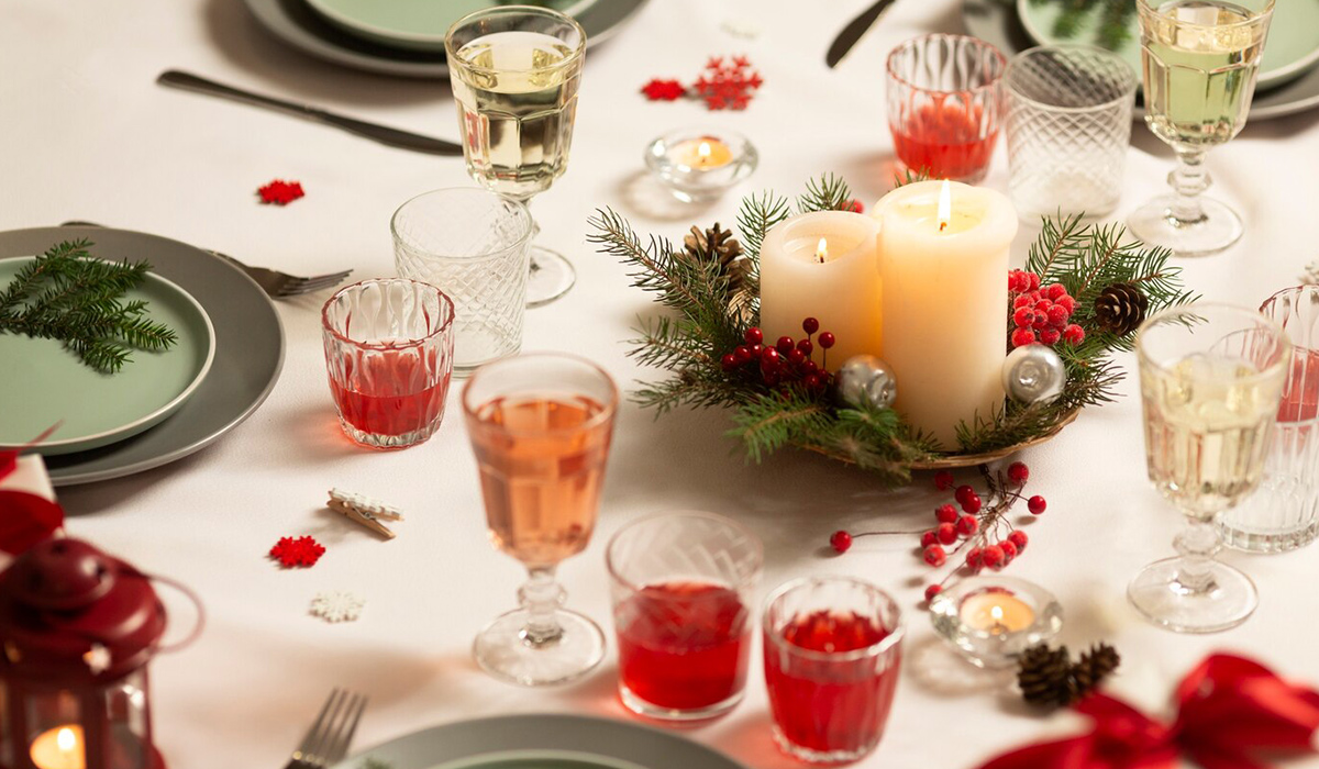 Новорічний стіл приваблює різноманітною фактурою столового скла та свіжим декором живих гілочок ялини. Традиційна біла скатертина Прованс Kelly 140 см підкреслює особливу ошатність сервірування та гармонію оздоблення. Центральне місце на столі займає святкова композиція зі свічок та декоративної новорічної гілки ягід із листям BonaDi 839-907 20 см червоного кольору, прикрашена набором ялинкових куль BonaDi 147-109 3 см 20 шт срібних. Елегантний набір столових приборів Zwilling King 1026444 68 предметів стильно доповнює красу обіднього посуду. Чарки для лікеру Bormioli Rocco America 122146BAU021990 80 мл розкривають глибину кольору напою та гармонійно поєднуються зі зручними чарками RCR Timeless 25878020406 80 мл. Скляні свічники та ліхтарики додають казкової магії свят.