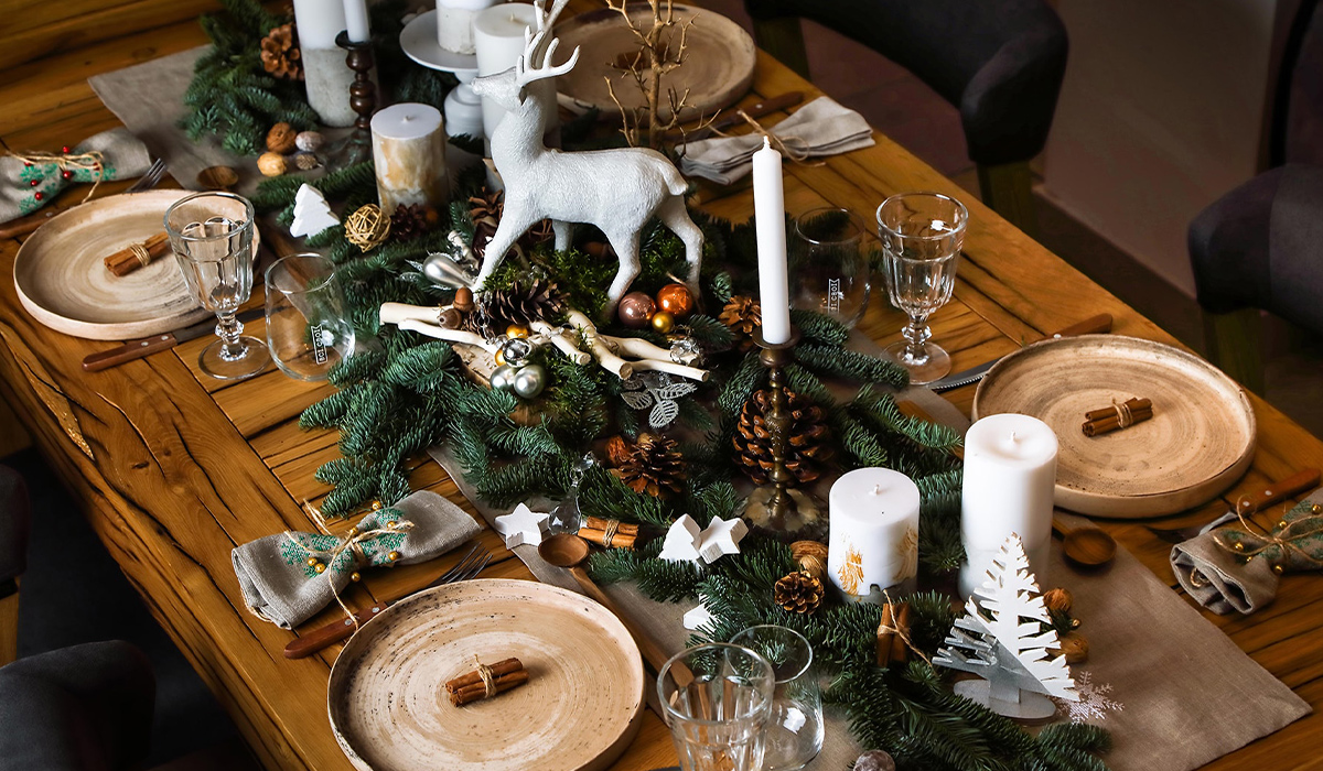Дерев'яний стіл, задекорований в скандинавському стилі, стане яскравим акцентом святкового інтер’єру. Свіжість та неповторний аромат розкішної хвої подарує особливу атмосферу новорічних свят. Гілка ошатно прикрашена набором ялинкових куль BonaDi 47-010 4 см 12 шт іриска та набором ялинкових куль пластикових срібних BonaDi 147-173 12 шт 4 см. Центральним акцентом столу є декоративна статуетка Олень BonaDi 218-798 34,5 см в оточенні елегантних білих свічок різних форм та дизайнів. Тарілка обідня Ipec Nordic Sand 30908555 27 см доповнює теплу палітру коричневих відтінків, а декоративна новорічна гілка BonaDi 839-315 73 см срібна додає святкового блиску композиції. Набір склянок високих Luminarc Versailles G1650 370 мл 6 шт своєю прозорістю і благородністю підкреслить колір і смак напоїв. Акуратні в’язки корицевих паличок, шишки, жолуді та горіхи приваблюють натуральними барвами та ароматами.