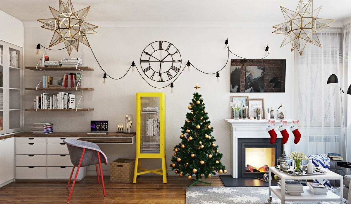 Святкове декорування вносить яскраві барви в інтер’єр світлої кімнати з каміном. Теплий природний відтінок підлоги, яку оздоблює керамограніт Golden Tile Terragres Dakota DT7120 19,8*119,8 см коричневий, дарує домашній затишок і спокій. Під вікном розміщений радіатор біметалевий SanTerra Deep 500*96 з боковим підключенням, що забезпечує комфортну температуру приміщення. Біля каміна стоїть ялинка Ковалівська лита 150 см, прикрашена набором ялинкових куль BonaDi 47-124 10 см 8 шт золото. Пуф Richman Матільда сірого кольору є зручним доповненням інтер’єру, адже його легко переміщувати та використовувати в різних цілях. Камін святково прикрашений новорічними оксамитовими чобітками для подарунків зі стразами BonaDi 592-105 45 см винного кольору, що принесуть багато приємних моментів дорослим і дітям.
