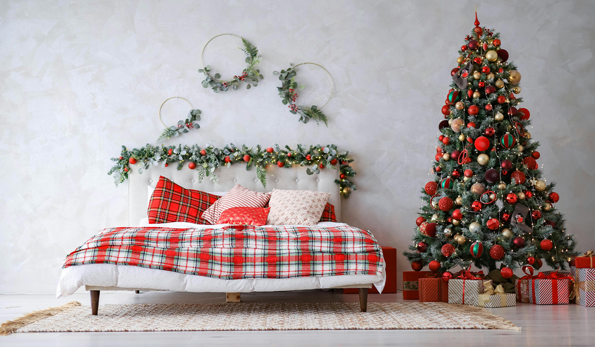 Магія новорічних свят заполонила білосніжний затишок сучасної спальні. Стильний ламінат AGT Armonia Large PRK302 Niapol 32 клас 4-V 8 мм вистеляє підлогу, додаючи світла та простору кімнаті. Центральне місце займає ліжко Шик Галичина Скай Columbus 17 160*200 з м’якою оббивкою молочного кольору, що забезпечує комфорт та здоровий сон. Плед Lanavitta Різдво 22284141 букле 140*200 см червоний та декоративні подушки створюють яскраві акценти серед повсякденного текстилю. Ніжні віночки та розкішна різдвяна гірлянда щедро прикрашають зону відпочинку. Праворуч розмістилася красуня-ялинка Siga Group Ковалівська лита блакитна 2,1 м, гармонійно оздоблена набором ялинкових куль BonaDi 147-585 40 шт червоний/золотий та іграшками на ялинку куля BonaDi 787-479 10 см червона та BonaDi J88-118 з оксамитовим покриттям 8 см червоного кольору. М’яке плетиво килима додає тепла і затишку, а гора святкових коробок ховає загадковість та приємні очікування.