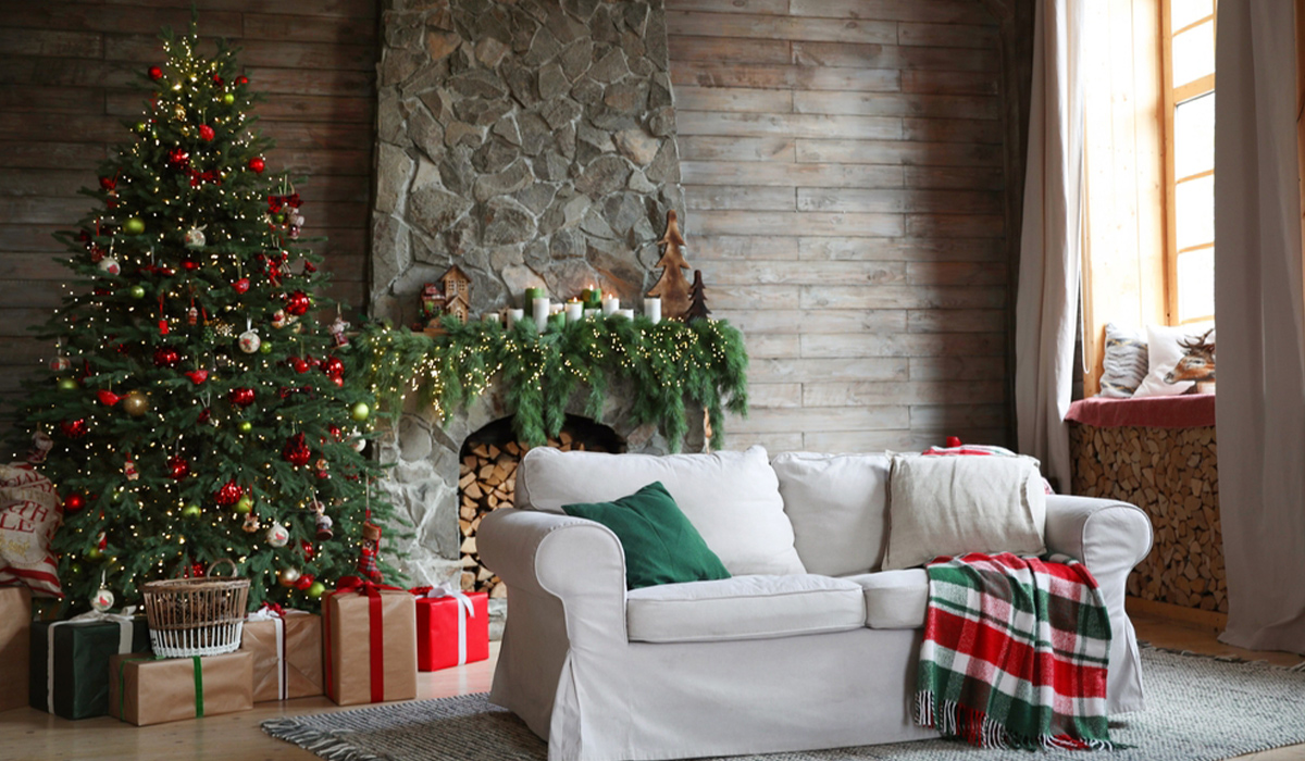 Вітальня з каміном – це особливе місце, де свята минають у колі важливих людей та родинних традицій. Світлу підлогу цієї кімнати вистеляє ламінат Kronopol Holiday 40214 Дуб Мальдіви 32 клас V-4 8 мм. Білий затишний диван розмістився перед каміном, його елегантно оздоблює подушка декоративна Decorator B 155 45*45 см зелена. На дерев’яному фоні стіни сяє мерехтливими вогниками гірлянди Elisey Роса 9133-011 100LED 10 м білого вишукана ялинка. Вона оздоблена набором ялинкових куль БД 147-583 12 шт 8 см, червоного кольору, іграшками на ялинку куля BonaDi 811-515 10 см білими, чобітками, дзвониками і сантами. Полиця каміна щедро прикрашена хвоєю та свічками циліндр розкривається Candy Light CL С07*20/1-6.3 зеленими та білими.