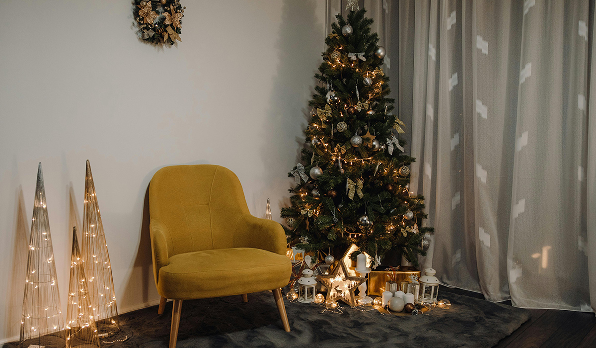 Простора вітальня залита теплим світлом різдвяних вогників та яскравих атрибутів величного свята. Підлога оздоблена ламінатом Kronospan Vintage Classic K479 Дуб Еспресо Капенче 4V 10 мм з екологічно чистих матеріалів. Крісло DLS Аква-1 жовте є одночасно комфортним та ефектним доповненням інтер’єру. Стіну прикрашає вінок новорічний BonaDi RM0-211 36 см. В кутку розмістилась ялинка Ковалівська лита 210 см, розкішно оздоблена іграшками на ялинку Ажурна куля BonaDi 788-839 8 см золото та новорічними Бантами BonaDi 787-418 20*24 см. Сріблястими блискітками сяє намисто на ялинку BonaDi 47-081 8 мм 2,7 м, а гірлянда Delux Icicle 75LED 2*0,7 м 18 flash дарує мерехтливу магію свят.