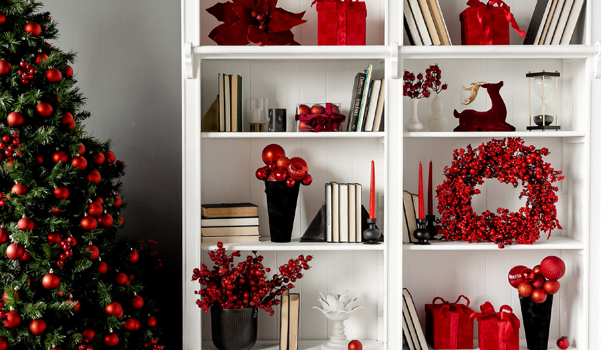 Фрагмент різдвяного оформлення кімнати ілюструє гармонію традиційних багряних прикрас у монохромному інтер’єрі. Стильна біла шафа перетворюється на чарівний книжковий будиночок, де кожна кімната-полиця є окремим затишком та святковим натхненням. Багряна пуансетія, золоторогий олень, ошатні подарункові коробки, набір ялинкових куль BonaDi 147-722 26 шт червоний мікс, наче чарівні герої книг, прикрашають просторі полиці та створюють новорічну атмосферу. Ваза Wilmax 996000 15*7 см створює стильні яскраві акценти в поєднанні з декоративною новорічною засніженою гілкою з червоними ягодами BonaDi 839-983 67 см. Свічка Collines de Provence Чорна троянда C3672RON 360 г з рослинного воску наповнить простір теплом та неповторним приємним ароматом. Ефектна ялинка Президентська лита 250 см, прикрашена набором ялинкових куль БД 147-583 12 шт 8 см, червоного кольору наповнює простір блиском і розкішшю ефектного декору.