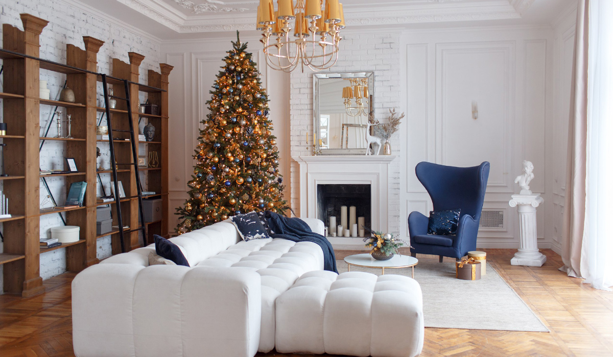 Вишукана вітальня запрошує провести різдвяні свята в красі та спокої своїх затишних просторів. В центрі кімнати розмістився диван кутовий Bellus Bublee 3Div Right Wooley 22907 білий, на якому можна зручно розміститися для приємних розмов довгими зимовими вечорами. Крісло Лестер синє є справжнім острівком розкоші, що вдало поєднується з білосніжними стінами та диваном. Плед в'язаний Прованс Шато коси 140*180 темно-синій та декоративні подушки продовжують волошковий настрій та врівноважують кольорову гаму кімнати. Комплект журнальних столиків Signal Muse II білий/золото стильно доповнюють красу та функціональність вітальні. Ефектна люстра наповнює світлом та теплом, відображаючись в просторому дзеркалі. Новорічна ялинка Віденська лита 230 см виструнчилась на всю висоту кімнати та втілює концентровану гармонію синьо-золотого декору. Набір ялинкових куль BonaDi 47-030 3, 4, 5, 6 см 40 шт виблискують золотим сяйвом на ялинці, наповнюючи святкову атмосферу піднесенням і врочистістю. Біля дзеркала бачимо декоративну статуетку Олень BonaDi 218-798 34,5 см, білосніжний символ зимових свят. Численні стелажі створюють фон давньої бібліотеки й додають особливого шарму святковій вітальні.