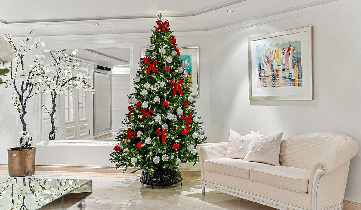Ошатна зала святкового передпокою виблискує розкішшю глянцевих поверхонь та ефектними елементами декору. Підлога оздоблена глазурованою плиткою Opoczno Camelia Cream 42*42 см і віддзеркалює яскраве світло світильників точкових Feron 8060-2 MR16 50W срібло. Бездоганну білизну стін забезпечує інтер'єрна фарба Dufa Wandfarbe D1a гіпоалергенна біла 7 кг. Центральною оздобою кімнати є ялинка Ковалівська лита 230 см, щедро прикрашена ялинковими іграшками скляними ручної роботи Д-174-2 Orbital 8 см, Orbital Д-439 8 см білий, Orbital Д-433-2 8 см та новорічними Бантами BonaDi 821-043 14*20 см червоного кольору. Велика площа дзеркальних поверхонь збільшує простір, додає світла і блиску розкішному інтер’єру.