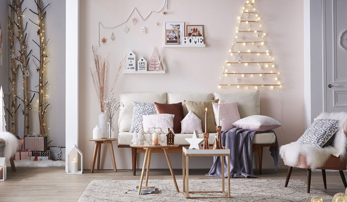 Світла вітальня заворожує затишком та мерехтінням святкових вогників. Підлога, яку оздоблює Ламінат Kronospan Super Natural Classic K484 Дуб Місті Стерлінг 4V 8 мм, наповнює теплом натуральної деревини. Розмаїття м’яких подушок та плед флісовий Emily Levity 94190748 125*200 см бузковий, що акуратно розмістилися на компактному дивані DLS Роланд молочний, створюють чарівне місце релаксу та відпочинку. Крісло Яріс рожевого кольору з хутряною накидкою поруч з диваном та навпроти вікна є чудовим місцем для читання книг. Подушка декоративна Decorator B215 45*45 см рожева ніжно доповнює пастельну гаму. Навпроти дивана стоїть столик кавовий Merx Moderno МН580 шампань 26008932 зі свічками, ялинками та декоративною статуеткою Будиночок BonaDi з LED-підсвіткою 733-725 15,5 см. Стіна прикрашена стильною ілюмінацією у вигляді ялинки, оформленої гірляндою Altalusse INL-2108U-200 Warm 200 LED 10 шт 2 м теплого білого світла. Рослинна композиція в кутку кімнати, оздоблена гірляндою Altalusse INL-2707B-40 Warm 40 LED на батарейках 6 м, створює ілюзію чарівного лісу та дарує відчуття казки протягом зимових свят.