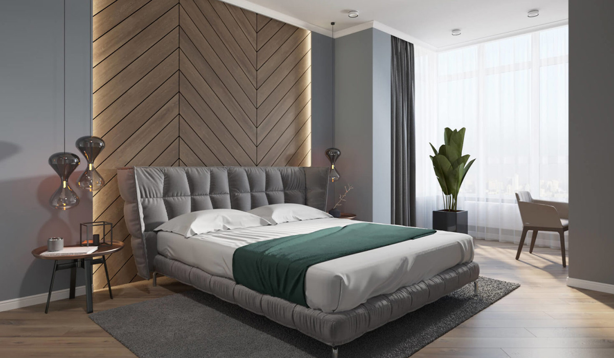 Поціновувачам краси природних матеріалів сподобається елегантне поєднання стильного сірого кольору з “дерев’яними” мотивами сучасних матеріалів у спальні. Простору кімнату наповнює приємне тепло ламінату Kronospan Atlantic К327 Дуб Хіллсайд 32 клас 4V 8 мм, демонструючи міцність і естетику надійного покриття. Стіну за ліжком оздоблює керамограніт Cersanit Wood Frenchwood Brown 1с 18,5*59,8 см, викладений візерунком “ялинка”, який додає динаміки та природних форм інтер’єру. Пастельний відтінок фарби гумової універсальної Element RAL 7040 сіра 1,2 кг на стінах гармоніює з дизайном ліжка з підйомним механізмом Albena Polly Логан 22 160*200 см бежевого, ворсистого килима та оксамитових штор. Багаторівневе освітлення в спальні виконує ефектна підсвітка акцентної стіни, підвісні футуристичні абажури з обох сторін ліжка та світильники точкові Esllse Gela 922374 1xGX53 WHITE IP20 білі на стелі. Завершує композицію кімнати розкішний зелений вазон у горщику Алеана Квадро 27*27*51 см граніт, що додає свіжості та природних відтінків інтер’єру спальні.