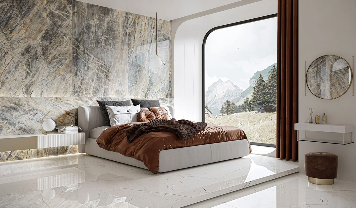 Холодний блиск мармурових поверхонь збалансований приємним краєвидом панорамного вікна та великою кількістю світла у спальні Italica Fiji. Білосніжний глянець підлоги з підвищенням, вистеленої керамогранітом Cerama Market Calacatta Grey 60*120 см, віддзеркалює деталі інтер’єру та створює багатовимірність простору. Керамограніт Italica Fiji Gold RT POL 60*120 см на стіні гармонійно відтворює палітру природних кольорів картини за вікном та ефектно сяє у променях сонця. Настільна лампа Altalusse INL-5102T-01 та люстра підвісна Altalusse INL-5102P-01 Gold з елегантним золотистим обрамленням додають чітких ліній та оригінальних форм приміщенню. Матова фарба вапняна Ферозіт 37 для стін та стель 10 л оздоблює білі поверхні та додає спокою та затишку кімнаті. Просторе ліжко з м’якими подушками пуховими IGLEN 50702 тік 50*70 см та стильним покривалом створює ідеальний комфорт розкішного місця для відпочинку.