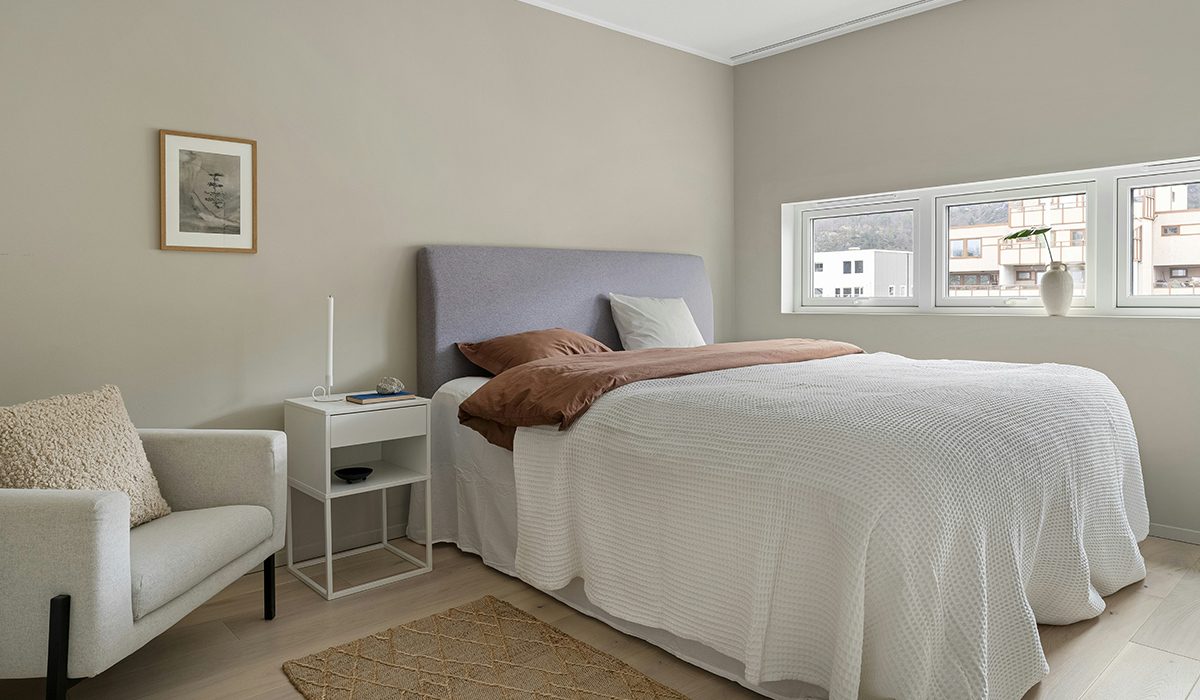 Спальня – це місце відпочинку, де спокій і тиша мають особливе значення, тому поєднання відтінків і текстур в інтер’єрі має створювати атмосферу врівноваження. В спальні Kronopol Zodiak теплі бежеві кольори з елегантним лавандовим вдало змальовують затишок і відчуття свободи. Гармонія підлоги, оздобленої ламінатом Kronopol Zodiak 4570 Дуб Телець 33 клас V-4 10 мм, переходить в рівновагу стін, покритих фарбою гумовою Farbex універсальною бежевою 1015 12 кг. Просторе ліжко з м’якою фіолетовою оббивкою створює ідеальне місце комфорту і затишку, а комплект постільної білизни SoundSleep Stonewash Adriatic Coffee 2800004540537 200*220 см додає глибокого карамельного відтінку і відчуття безпеки. Покривалом для нього служить приємний і практичний плед Lanavitta Topaz 155248 140*200 см сірий, що зігріє в холодні вечори та додає естетичного вигляду. М’яке крісло DLS Магнум Steel молочного кольору творить затишний оазис для читання книги, вишивання чи перегляду цікавого фільму. Розкішна ваза Gilde 28855 Трава 16*23 см біла на підвіконні демонструє меланхолійний настрій і приємний спокій кімнати.