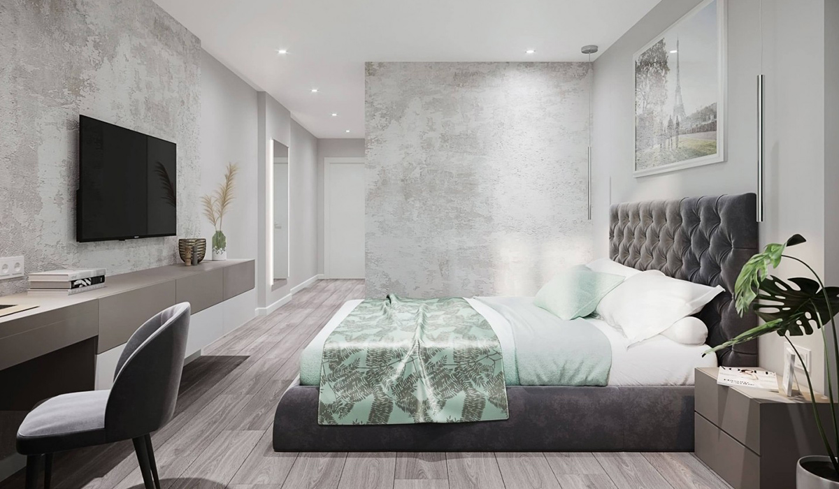 Спальня NaturalLine – найкраще поєднання свіжих прохолодних відтінків та відчуття комфорту, що ідеально підходить ритму сучасного життя, де домашній затишок є острівком відновлення та наповнення. Просторе ліжко Richman Кембрідж 180*200 темно-сіре з м’яким узголів’ям – це ергономічний комфорт для тіла, солодкі сни, вечірній релакс з книгою та ранкові ритуали планування. М’ятний колір білизни та монстера поруч створюють атмосферу свіжості та спокою, яка гармонійно переплітається з природною естетикою підлогового покриття. Ламінат Kronospan NaturalLine 3487 Дуб благородний додає інтер’єру, створюючи надійну та стильну основу для всього меблевого ансамблю. Біля ліжка розміщена тумба приліжкова GF Roni RN-2 Cobalt grey/Ristretto oak, забезпечуючи зручне місце для зберігання особистих речей. Над нею, немов тонка ювелірна лінія, спускається підвісний світильник Nowodvorski Laser 490 10453. Його благородне покриття додає інтер’єру нотки розкоші та створює спрямоване затишне світло для вечірнього читання. Куточок для відпочинку або короткої роботи доповнює металевий обідній стілець Bonsso Pio New Darwin 452 у стриманому сірому кольорі. Його лаконічний дизайн та ергономічна форма підтримують загальну концепцію комфорту, не перевантажуючи простір. Фінальним штрихом, що об’єднує всі елементи в єдину композицію, є стіни, оздоблені декоративною фарбою Ircom Decor Марракеш. Її м’які переливи та особлива фактура створюють ефект легкого оксамитового сяйва, перетворюючи спальню NaturalLine на справжній витвір дизайнерського мистецтва, де кожна деталь працює на ваш відпочинок.