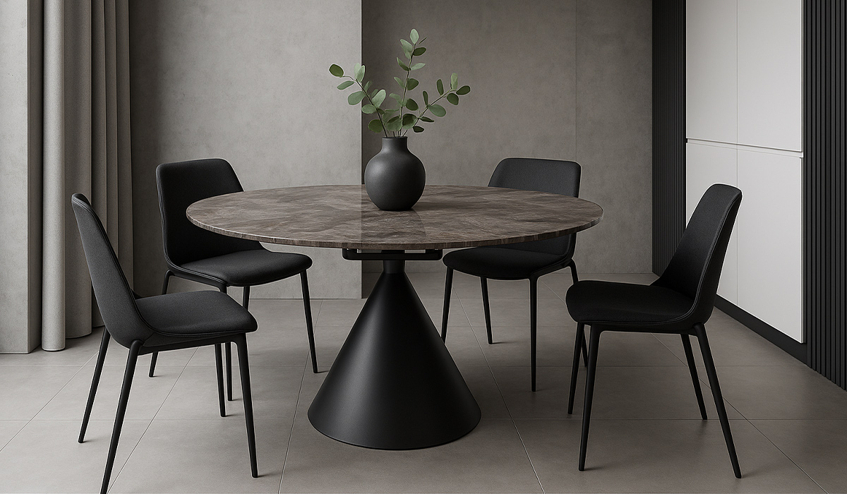 Строга геометричність цієї столової кімнати в стилі хай тек дозволяє зберегти максимальну функціональність простору та розкрити справжню естетику стриманої палітри кольорів. Тут гармонійно поєднуються сірі відтінки керамограніту Атем Denver Grey 60*60 см на підлозі та фактурна поверхня шпалер вінілових Vinil Бетон ЕШТ5-1563 сірих, що створюють елегантну базу інтер’єру. Круглий стіл обідній розкладний Євродім Tokyo T7539-135 printed glass GW068 з глянцевою стільницею з гартованого скла є центральним елементом їдальні. Його дзеркальна поверхня та металевий каркас підкреслюють ознаки стилю, а розкладна конструкція розширює функціональність кімнати. Увагу привертає акцентна стіна, оздоблена 3D-панеллю MARCO decor 12010-281-SP чорне дерево 120*10*2900 мм (0,34 кв.м) з контрастним білим прямокутником посередині. Вона додає світла і структурності своїми чіткими лаконічними формами. Чорна ваза з декоративною гілкою евкаліпт BonаDi 137-014 47 см зелений на столі створює особливу атмосферу театральності та затишку, додаючи природних нот та свіжості інтер’єру.