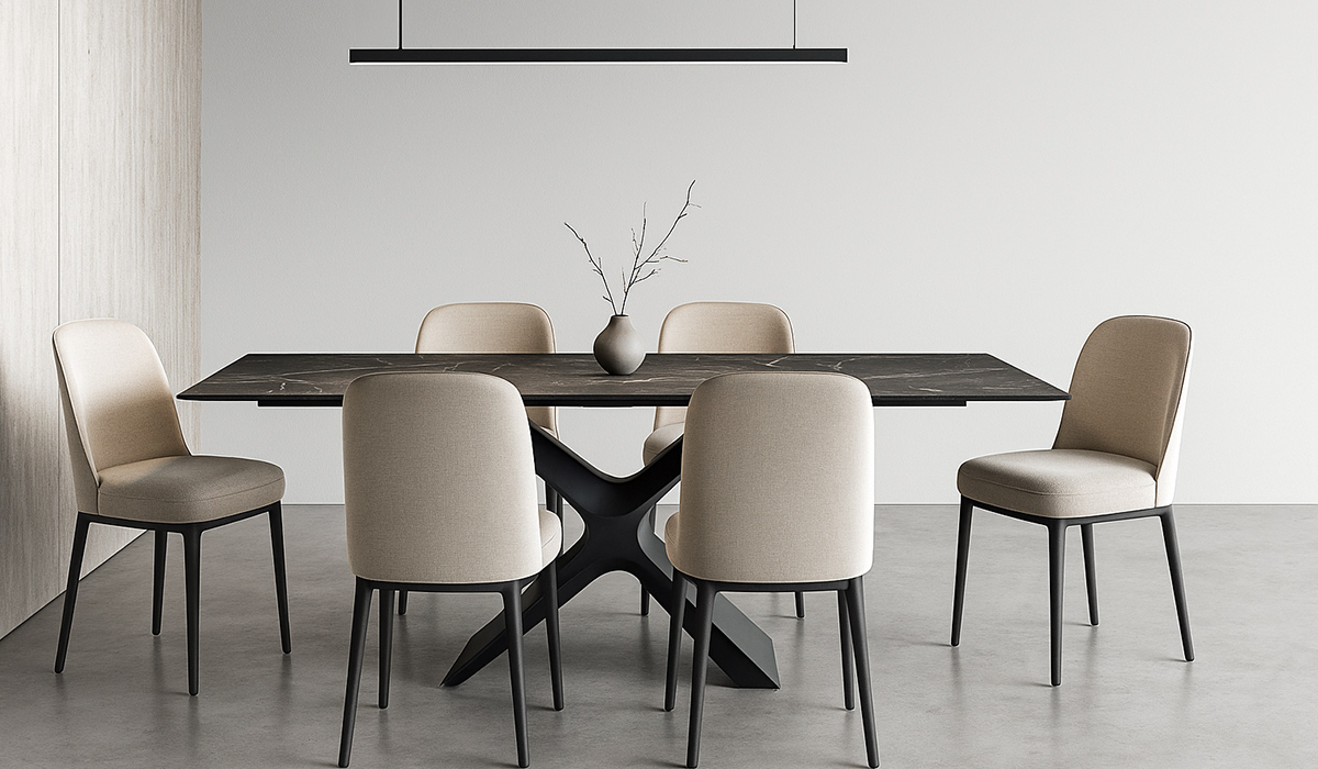 За основу цієї столової кімнати обрано сіро-бежеву палітру, яку доповнюють виразні чорні деталі для створення стильного та гармонійного інтер’єру. Підлога імітує цілісне кам’яне покриття завдяки безшовному укладанню керамограніту Cersanit Stamford GPTU 605 grey Rec 59,8*59,8 см сірому. На її фоні елегантно виділяється стіл обідній розкладний Bjorn Ragnar Shks Black Matt з мармуровою поверхнею та хрестоподібним виконанням опори. Він акцентно підсвічується люстрою підвісною Berger 7018-PL-16 LED 16W 4000K Black, що виконана в сучасному мінімалістичному дизайні. Особливого тепла і затишку додають стільці обідні металеві Vetro М-140 айворі з чорними ніжками та м’якою світлою оббивкою. Вони створюють зручні місця за столом та збагачують інтер’єр своєю витонченою естетикою. Стіл прикрашає керамічна ваза Gilde Радон 32573 11,5*21 см з декоративною композицією, що тонко підкреслює стриману вишуканість кімнати та додає їй завершеного вигляду.