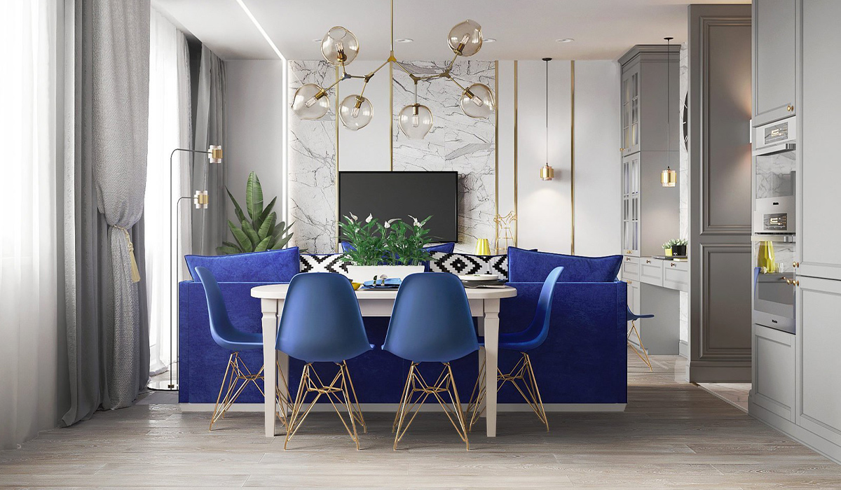Дивовижне поєднання елегантного сірого та глибокого синього кольорів створює оригінальне рішення для столової кімнати, що втілює сучасний комфорт та традиційний затишок. Природна гармонія ламінату Classen Galaxy XL WR 55817 Дуб світло-сірий 32 клас 4V 8 мм підкреслює легкість та невагомість білих стін та віконного декору. Золотисті лінії стін продовжують свої химерні креслення в опорах стільців обідніх Nowy Styl Nicole HN Black PL-12 синіх та витончених розгалуженнях люстри Sirius B N4059/6 AB. Освітлення кімнати вносить яскраві акценти, чудернацькі форми, дивовижні лінії та непомітні вкраплення, як от світильник світлодіодний Maxus 1-SDL-003 6W 3000K. Центральне місце займає стіл обідній Merx Luigi 160 білий 26003694 з ефектними стільцями волошкового кольору, що стильно поєднуються з сучасним дизайном і кольором дивана. Не менш важливу роль в оформленні столової відіграє естетика посуду, тому блюдо з бортом Bormioli Rocco Grangusto 410711MDF121990 27 см на столі – це універсальне рішення, що підкреслює витончений стиль інтер’єру та непересічний смак господарів дому.