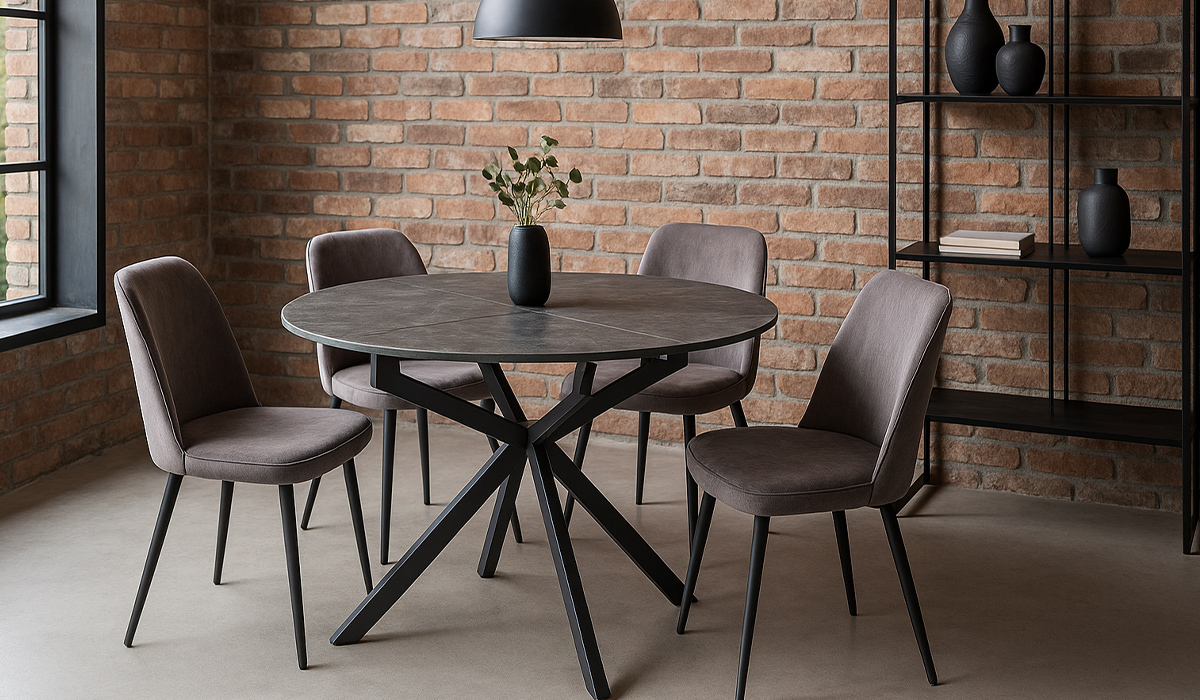 Чарівність цієї їдальні завуальована в навмисній недбалості та продуманій брутальності стилю лофт. Його впізнаваною візитівкою є текстура цегляної кладки. В даному інтер’єрі вона відтворена поєднанням двох видів клінкерної плитки Golden Tile Brickstyle Seven Tones 34Р010 6*25 см та Brickstyle Brick KBР010 6*25 см помаранчевої, що не обтяжує простір завдяки достатній кількості природного світла в кімнаті. Використання чорного кольору для оформлення вікна, меблів, декору нагадує естетику промислових цехів, фабрик, складських приміщень, звідки, власне, походить стиль. Тут гармонійно виглядає світильник підвісний Nowodvorski Egg M 10318 чорний – функціональний аксесуар, що забезпечує достатнє зональне освітлення, фокусуючись на поверхні столу обіднього розкладного Vetro Офелія TML-1250 105*105 см спайдер грей глянець/чорний. Матова поверхня вази Gilde 56159 Brocca 9*10*13 см з декоративною гілкою евкаліпта BonаDi 137-014 47 см зеленою створюють ефект глибинної загадковості та непередбачуваності. М’яке освітлення та елегантна оббивка стільців збалансовують холодний відтінок бетонної підлоги, забезпечуючи базовий комфорт та своєрідний затишок їдальні.