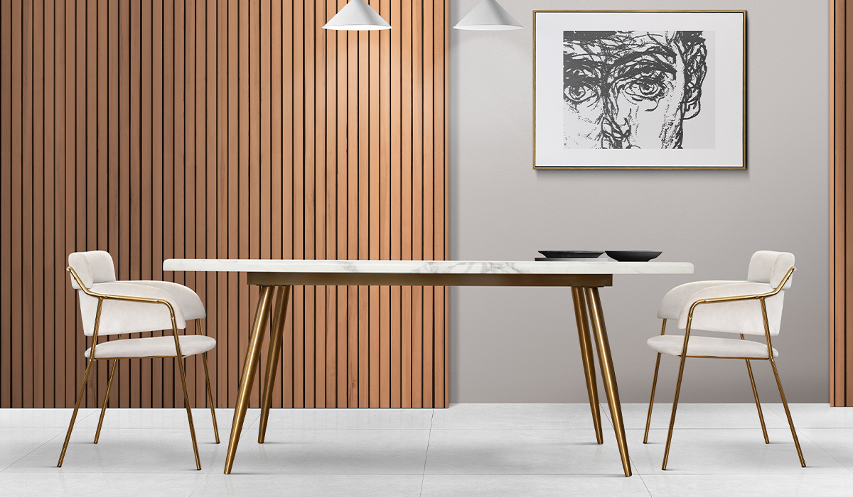 Сучасна столова Intercerama Superwhite пропонує простоту та комфорт домашніх умов. Підлога білого кольору створює елегантну атмосферу простору завдяки керамограніту Intercerama Superwhite 19061 Rec 60*60 см без плінтусного обрамлення. Декоративна акустична панель АП-000 DAC01 дуб кардинал покращує якість звуку в кімнаті та творить вдалу композицію з частиною стіни сірого кольору, де використана фарба гумова універсальна Bayris Multi Flexible Paint Ral 7046 та розміщена картина. Стіл та стільці білого кольору з золотим обрамленням в центрі приміщення акцентують на основній функції столової. Два світильники підвісних Vio Concept AtVC VCDS-MD76652-1 забезпечують добре освітлення простору. Чудовим доповненням сучасного інтер’єру стане тарілка супова Limited Edition Mekkano ZH-7015-5 20 см.