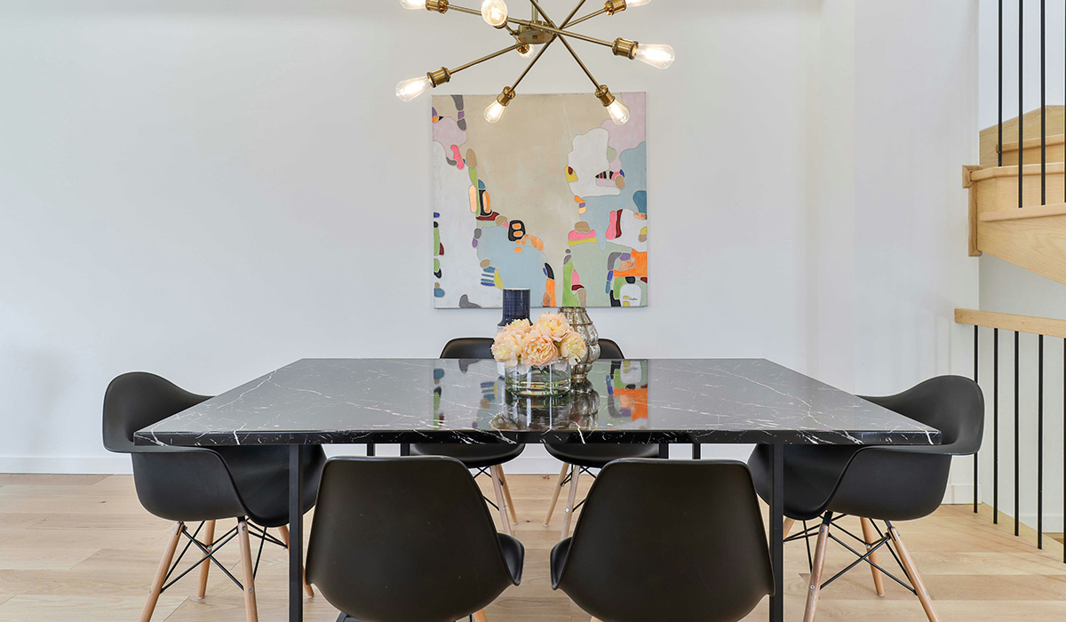 Кімната для приймання їжі є максимально функціональною та водночас стильною та красивою. Світла підлога, вистелена ламінатом Kronopol Holiday 40214 Дуб Мальдіви 32 клас V-4 8 мм, створює теплу основу для інших деталей. Стіни, пофарбовані інтер'єрною фарбою акрилатною Tikkurila Joker А біла 9,0 л, випромінюють спокій та класичну монотонність. Елегантний перехід між підлогою та стінами створює плінтус Arbiton Avia 60 ST610 білий 2000 мм. Центральним атрибутом кімнати є стіл обідній розкладний Vetro TM-76 120*80 см чорний онікс/чорний, що забезпечує достатньо місця для щоденного обіду чи святкового застілля. Стіл прикрашає естетична композиція декоративний букет піони Villeroy & Boch білий, що ніжно згладжує строгість темної мармурової поверхні й створює цікавий рослинний акцент. Картина в яскравих барвах авангардизму додає динаміки та життєвої енергії простору.