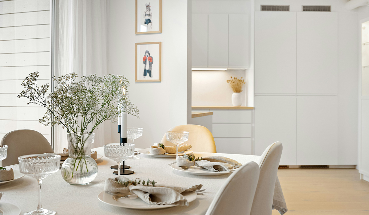 Білий колір інтер’єру – це завжди вишуканість та елегантність, легкість та невагомість. В оздобленні столової кімнати він створює атмосферу довіри та єднання, що особливо важливо для спільних сімейних трапез. Теплі ноти ламінату Kronospan Castello K406 Дуб Еурус 32 клас 8 мм на підлозі пом’якшують сувору чистоту стін та меблів і додають кімнаті приємного затишку. Стіл обідній Skandinave Prizma F1 160*90 см дуб в центральній частині розкошує багатством сервірування та ефектного декору. Скатертина лляна Limaso Florida KIPL1-240 140*240 см поєднує природну простоту та витончену досконалість. Ніжні суцвіття гіпсофіли у вазі Viva Mono 6841684 17 см зачаровують своїм прозорим мереживом, а витончені підсвічники Elisey Світло в темряві 9137-009 27,5 см виструнчились в ідеальну композицію врочистого піднесення. Сяють прозорим склом келихи для коктейлів Bormioli Rocco America 122150GSB021990 275 мл, а їх вишукані форми додають особливого шарму сервіруванню. Стільці обідні металеві Vetro N-44 сірі створюють комфорт за столом та ідеальну гармонію обідньої зони.