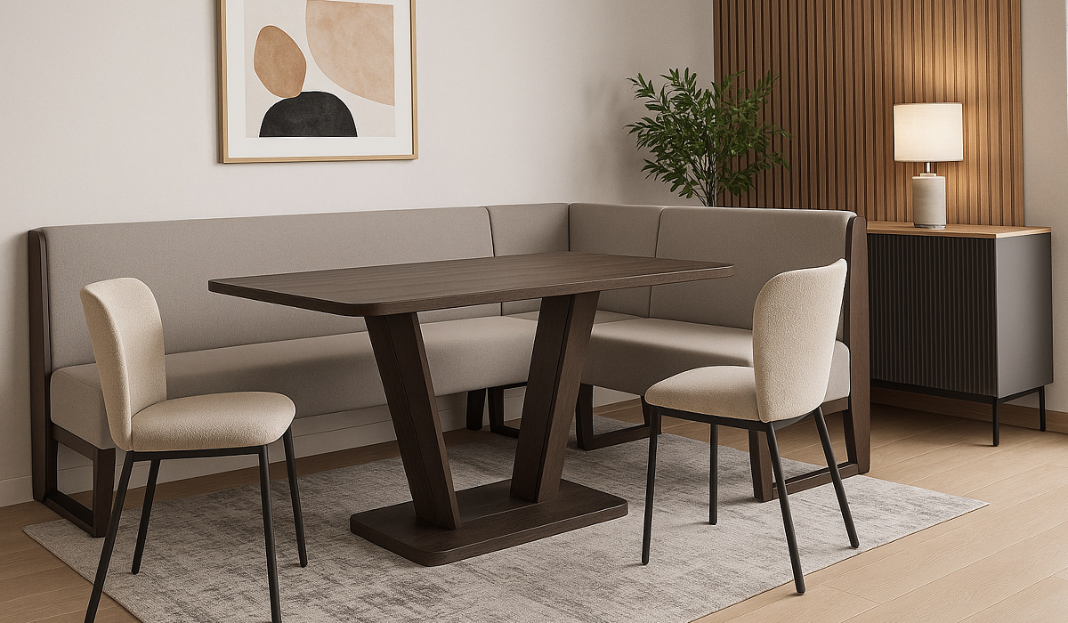М’яке приємне світло, зручне місце за столиком, домашня атмосфера – найкраще поєднання для того, щоб поділитися враженнями минулого дня та відчути силу і спокій рідної домівки. Столова Kronospan Eurus запрошує до відпочинку, тихих розмов за смачними стравами та теплими напоями. Тут розмістився кухонний куток дерев'янний Діана Міссоні 19 сірий з м’якою оббивкою, де комфортно дорослим і дітям, а додаткові стільці обідні металеві Vetro М-140 білий пісок/чорний можна розмістити в будь-якій частині кімнати, використовуючи лише ситуативно. Стіни покриті інтер'єрною фарбою латексною Dufa Megalatex D120 матовою білою 14 кг, що створює глибоко-матовий шар, стійкий до миття і механічних пошкоджень. На підлозі бачимо ламінат Kronospan Castello K406 Дуб Еурус 32 клас 8 мм з теплою натуральною поверхнею, що додає затишку й елегантності інтер’єру. Комод Piaski Nova KSZ104 чорний продовжує вертикальні лінії 3D-панелі MARCO decor 12011-122-SP дуб золотий 120*11*2900 мм (0,34 кв.м) на стіні, створюючи завершену композицію рель’єфних поверхонь. Зелень кімнатного вазона ефектно оживляє простір, збагачуючи натуральну палітру столової кімнати.