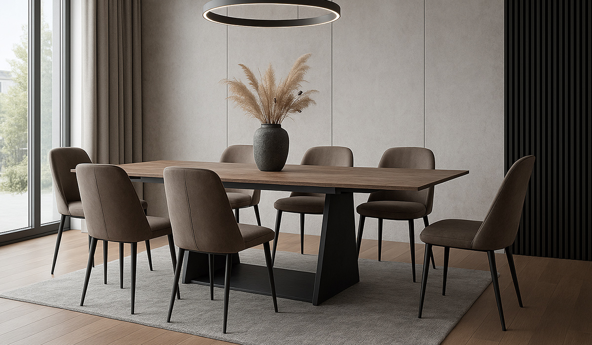 Сучасна їдальня в стилі модерн пропонує комфортний простір для сімейних обідів чи святкових частувань з друзями. Достатньо світла та природні відтінки підлоги, оздобленої ламінатом Kronostep Дуб Альпійський 8199 4V 32 клас 8 мм, створюють приємний затишок з нотками теплоти і спокою. Об'ємна текстура та глибокий відтінок чорного дерева 3D-панелі MARCO decor 12010-281-SP 120*10*2900 мм (0,34 кв.м) додають інтер'єру динамізму та елегантності, створюючи виразний фон і надаючи приміщенню глибини. Центральне місце в їдальні займає стіл обідній розкладний Bjorn Edmund Agate Glossy. Його глянцева поверхня додає нотку розкоші та сучасності, водночас забезпечуючи практичність завдяки функції розкладання, що дозволяє легко адаптувати розмір столу до кількості гостей. Навколо столу розставлені стільці обідні дерев'яні Меблі Тиса Лео доріс 15/бук зі зручними спинками та широкими сидіннями. Вони елегантно доповнюють естетику кімнати, водночас забезпечуючи винятковий комфорт при використанні. Обідню зону освітлює люстра світлодіодна Esllse Stella 921070 R APP 96 Вт сіра/біла, що дає можливість змінювати колір світла, яскравість та керувати нею за допомогою вимикача, пульта чи смартфона. Легкість та функціональність простору цієї кімнати сприяє приємному відпочинку під час приймання їжі.