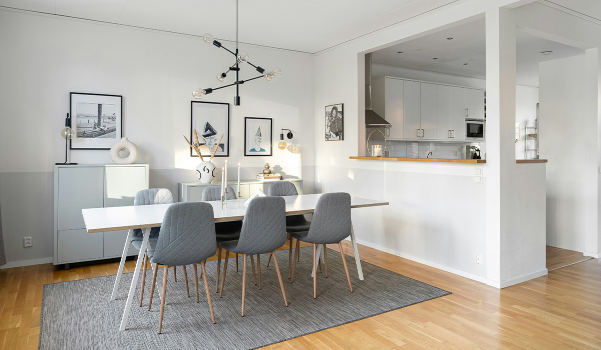 Чиста комбінація сріблястого сірого та меланхолійного білого в інтер’єрі їдальні дарує свіжість і легкість простору для спокійних трапез та душевних розмов. Лаконічний дизайн столу обіднього розкладного Special4You Montis E6828 Marble не суперечить стриманій естетиці кімнати, а стільці обідні металеві Richman Гаррет Сімпл 31 сірого кольору додають бажаного комфорту під час застілля. Ламінат Rezult Floor Nature FN102 Дуб класичний 32 клас 8 мм урівноважує прохолоду сіро-білих барв та додає теплих натуральних відтінків. Люстра ALFA GOFFER 25555 5ХE27 60 Вт та настільна лампа Nowodvorski Monaco 9308 чорна створюють легку динаміку простору химерним плетивом темних ліній та виразністю форм. На столі запалені свічки конічні Ester & Erik 0466-31 42*2,6 см білі у витончених свічниках, що дарують тепло домашнього затишку.