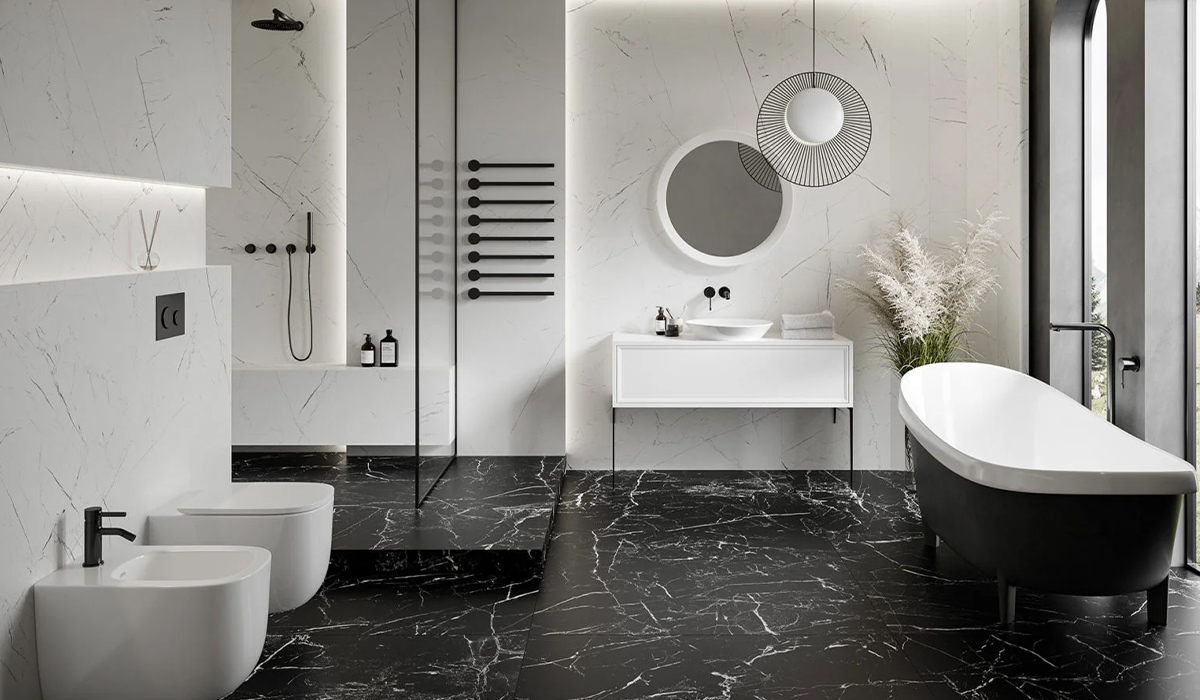 Павутина хаотичних ліній мармуру вносить природну динаміку в монохромний інтер’єр ванної кімнати. Чорним по білому вписані деталі, а заокруглені форми згладжують класичну строгість кольорів. Велика кількість сонячного світла створює ефект багатогранності та об’ємності підлоги, яку оздоблює керамограніт Casa Ceramica Nero marquinia 60*120 см чорного кольору, а його білі лінії підкреслюють багатство структури. Естетика стін заворожує грою тіней та прихованим сіянням підсвіток, що створюють рельєфність та багатошаровість приміщення. В такому освітлені білий керамограніт Ego Ceramics Ontario White R. pol 60*120 см на стінах набуває нових тонів та півтонів. Компактне біде підвісне Koller Pool Round Smart RN-0495-B повторює конструкцію унітаза та продовжує гармонію глазурованих білосніжних поверхонь сантехніки. Його доповнює ефектний чорний змішувач для біде Laveo Pola BAP_732D, що елегантно підкреслює полотно світлих стін. Вишукана форма умивальника Jaquar JDS JDS-WHT-25901 63,5*41,5 см поєднує красу і функціональність, а змішувач для умивальника KFA Armatura Moza Black 5039-810-81 створює чіткий акцент лаконічності та досконалості. Дзеркало Ювента Neo Round 60 см з освітленням по периметру збільшує внутрішній простір кімнати. Рослинний декор збагачує інтер’єр барвами живої природи.