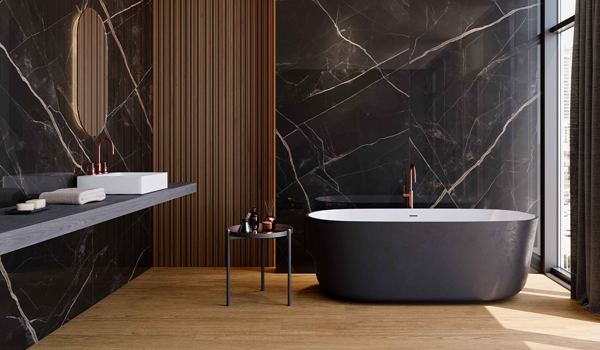 Простора ванна кімната з панорамним вікном дозволяє сміливо експериментувати з темними кольорами та різноманітними матеріалами. Така гра барв зменшує простір та водночас додає вишуканості та ефектного шарму. Мармурові візерунки стін, оздоблених керамогранітом Casa Ceramica Nero marquinia 60*120 см, створюють природний лабіринт білих ліній, що малюють складну геометрію простору. Напротивагу холодним кам’яним поверхням, дерев’яна структура підлоги, викладеної керамогранітом Cersanit Wood Sandwood Brown 1с 18,5*59,8 см, врівноважує теплотою і натуральністю відтінків. Цю гармонію продовжує 3D-панель MARCO decor 12912-122-K дуб золотий 129*12*2900 мм (0,37 кв.м) затишком і елегантністю гофрованої поверхні. Виразним акцентом в оригінальній театральності кімнати є умивальник Jaquar Continental CNS-WHT-905 41*41 см білого кольору, що створює ефектний контраст інтер’єру. В такому поєднанні відтінків дзеркало Wellss mirrors Aria Luce S з підсвіткою 110*60 см набуває легкої таємничості й казковості. М’який рушник махровий Home Line 177349 450 г/м2 70*140 см білий на темному фоні здається невагомою хмаринкою затишку і комфорту.