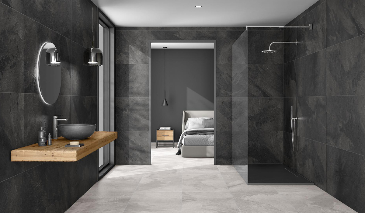 Сміливі темні відтінки у ванній впевнено домінують в сучасних інтер’єрах, демонструючи стиль і смак успішної особистості. Фото зображує радше функціональний простір індустріального типу, де лише окремі деталі натякають на домашній затишок і спокій. Проте стильне поєднання матеріалів та особисті дрібнички тонко підкреслюють унікальність дизайну кімнати. Керамограніт Cerama Market Dazzle Zurich oxide Grande lap 60*120 см чорний на стінах виразно контрастує з керамогранітом Megagres Carrara Glorious White 60*60 см білим на підлозі, створюючи класичний дует базових кольорів. Інноваційні функції душової системи KFA Armatura Silvia Chrome 2039-501-00 забезпечують максимальний комфорт і насолоду під час купання, а її привабливий дизайн легко інтегрується в загальну концепцію кімнати. Бокова стінка Armaform Elbe Black 113-09326B 90*190 см з гартованого скла захищає від бризок, легко очищується та елегантно оздоблює зону купання. На протилежній стіні розміщена дерев’яна полиця під умивальник, що помітно згладжує строгість простору, додаючи теплоти й світла. Тут яскравим акцентом є дзеркало Studio Glass Ark Royal White Iron Mirror 60*60 см та світильник підвісний ALFA RONDA 9120 GRAPHIT 1хE27 230В 60 Вт, які додають глибини, блиску і вдало довершують естетику кімнати.