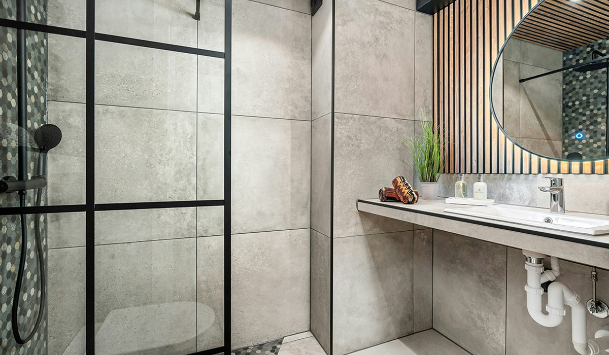 Експерименти з попелястими відтінками у дизайні підійдуть оптимістам, яким такий колір принесе заспокоєння і рівновагу. Якщо мова йде про ванну кімнату, то різноманітність оздоблення дозволяє обирати з широкого спектра відтінків та дизайнів. В даній кімнаті стіни та підлога викладені керамогранітом Cerrad Diosa Light Grey Rec 59,7*59,7 см та стильно доповнені чорними лініями швів та кутників, що освіжають і увиразнюють його бетонну естетику. Увагу привертає оформлення зони для купання, де душова система KFA Armatura Moza 5036-910-81 Black елегантно поєднується з боковою стінкою та строкатою мозаїкою. Така комбінація створює виразний акцент і гармонію базових кольорів. Фрагмент стіни покриває 3D-панель UMI 11811WP 14133-27/1 2,9 м в теплому відтінку деревини, що пом’якшує холодну строгість поверхонь. На ній розміщене кругле дзеркало Арена Loft Siena з підсвіткою 70*70 см. Воно виокремлює зону вмивання та візуально "розширює" кімнату, створюючи відчуття глибини та об'єму. Витончена полиця вздовж стіни дозволяє розмістити умивальник меблевий Ювента Piedra 60 см з сифоном для кухонної мийки + злив McAlpine HC7+FSW50P-25, мийні засоби, рушники та декор.