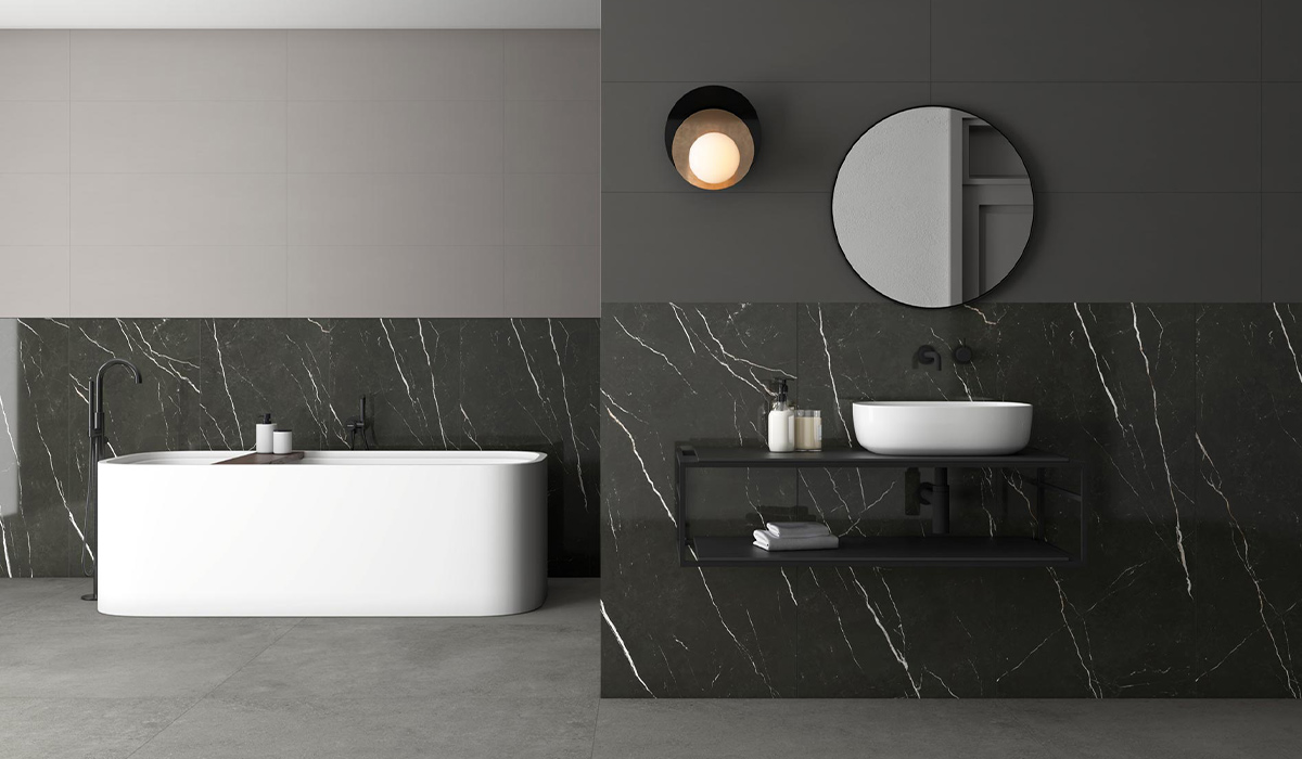 В дизайні цієї ванної кімнати вміло поєднано монохромний контраст, де важливу роль відіграє глибокий графіт. Він збалансовує поєднання чорного керамограніту Атем Aurora Marquina Matt 60*120 см та білої сантехніки, додаючи легкості та пом’якшуючи полярність кольорів. Сірий керамограніт Cerrad Modern Concrete Silver 79,7*159,7 см вступає в гармонійний дует з керамогранітом Cersanit Candy GPTU 1202 grey 59,8*119,8 і разом наповнюють кімнату відтінками, додають структурності та затишку. Умивальник на стільницю Laveo Desna VUD_6250 50*35 см стає виразним акцентом на темному фоні, забезпечуючи зручне місце для вмивання разом з елегантним змішувачем KFA Armatura Moza Black 5039-810-81. Кругле дзеркало Studio Glass FLETCHER сенсорний вимикач 70*70 см є відмінним аксесуаром, що збагачує інтер’єр м’яким світлом, додає нових форм та глибини простору. Такий інтер’єр сподобається сміливим та енергійним людям, що цінують комфорт та елегантність в побутових умовах.