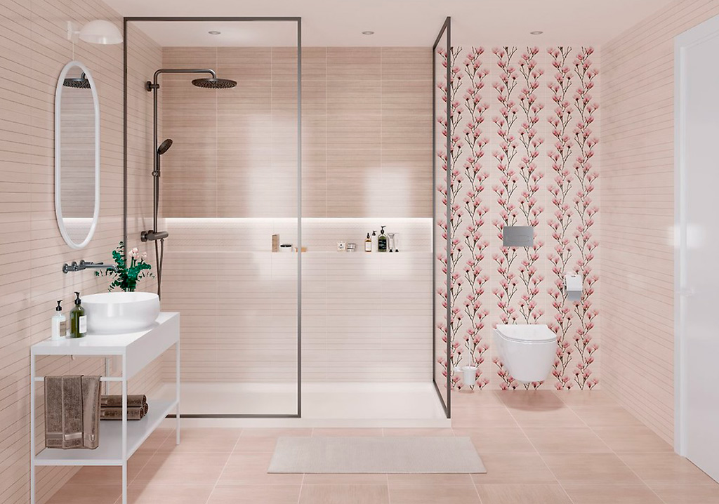 Стіни прикрашені плиткою Cersanit Carmel Brown 2540 см коричневого кольору, яка дарує відчуття тепла і вишуканості, та плиткою Cersanit Carmel Floral motifs 2540 см сірого кольору, додаючи до інтер'єру елементи природи та грації. А завершальним штрихом є дзеркало Арена Loft 4 з підсвіткою розміром 90*50 см, яке додає простору і робить це приміщення ще більш елегантним.