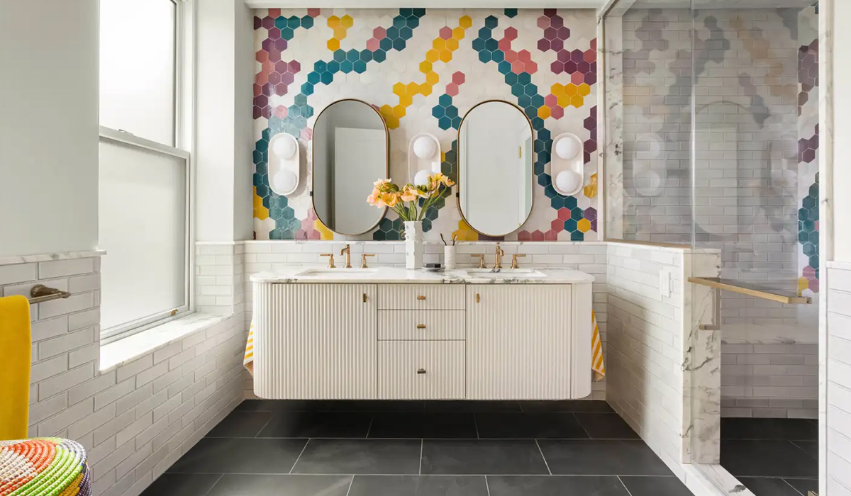 Кожного ранку, окрім запашної кави, потребуємо невеличкої порції натхнення для продуктивного дня. Ванна Cersanit Normandie відкриває двері барвистої фантазії для активного початку дня чи романтичного вечора. Квіткові барви основної стіни створюють збалансовану динамічну палітру, що привертає увагу та активізує творчі здібності. Сміливий чорний колір керамограніту Cersanit Normandie Graphite 29,7*59,8 см додає таємничості та збалансовує поєднання світлих тонів, що при достатньому природному освітленні виглядають яскраво і вишукано. Гіпсова плитка АРТ-декор Мадейра 4820153560352 0,45 кв.м додає рельєфності та особливого шарму стінам. Праворуч – затишний і практичний простір для гігієнічних процедур, до якого ведуть елегантні прозорі душові двері Duka Natura 4000 AR-DTW L Pro Care 100 см. Умивальники Jaquar Continental CNS-WHT-701 48*36,5 см білі розміщені так, щоб ранок починався у гармонійному тандемі, якого розділятиме лише запашний букет весняних квітів у розкішній вазі Bona Di Ірма 795-438 33 см білого кольору. Два стильні дзеркала Luxury Wood Freedom SLIM ясен темний 50*80 см в дерев’яних рамах збагачують естетику кімнати елегантними формами та витонченими лініями, дарують додатковий простір та чітке зображення. Лірична атмосфера легкості дарує приємну бадьорість та заряд енергії на цілий день.