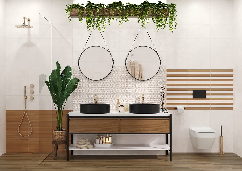 Ванна кімната Cersanit Solange - це особливе місце, де час майже зупиняється, дозволяючи поринути в атмосферу найвищого комфорту. Ще на вході погляд зачаровує душова система REA Lungo Gold Маt + BOX REA-P4160, з її блискучою поверхнею в золотистому відтінку, яка надає всьому інтер'єру нотки неперевершеної елегантності. Над раковиною розмістився змішувач для умивальника KFA Armatura Moza Gold 5032-815-31, що вражає своєю стильною та красивою конструкцією. Стіни кімнати декоровані плиткою, додаючи приміщенню унікальний характер. Плитка для стін Cersanit Solange Light grey 2540 см сіра створює світлу та повітряну атмосферу, тоді як плитка Cersanit Solange Wood Str 2540 см коричнева додає до неї тепла і природності. Вдало поєднується і плитка Cersanit mix Str 25, створюючи гармонійний перехід між ними, а плитка Cersanit Solange Geo 2540 см придає цікавості та текстури. Не можна недооцінювати й важливість дрібниць в дизайні. Чорний тримач для туалетного паперу Jiamei 5055В стає фінальним штрихом, надаючи мінімалізму і завершуючи всю композицію ванної кімнати.