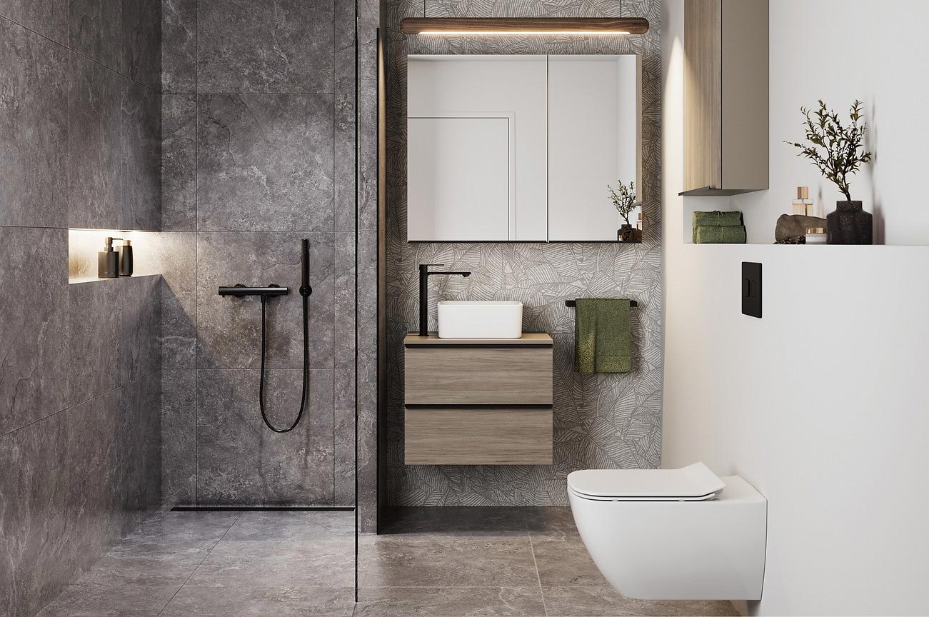 Відвідавши ванну кімнату Cersanit Tech Line, відчуваєш ніби побував у спа-комплексі, де кожний елемент обрано з найвищою увагою до деталей. Стіни та підлога, покриті керамогранітом Intercerama Virginia 33072 у темно-сірому відтінку, надають простору атмосфери сучасності та холодного модерну. Самим серцем цього приміщення став інсталяційний модуль Cersanit B604 Tech Line Opti. Унітаз VIRGO з легким натиском на кнопку OPTI B2 ідеально вписується в інтер'єр, додаючи світлого відтінку до загального вигляду. Біля душової кабіни розташувався високий змішувач для умивальника Imprese Vaclav f03506410AB у чорному кольорі. Він, немов майстерно злитий з підвісною тумбою, надає вишуканості й акценту всій композиції. Елегантний умивальник Jaguar Continental CNS-WHT-905 розміром 41*41 см, гармонійно поєднується зі всіма елементами, створюючи цілісний образ кімнати.
