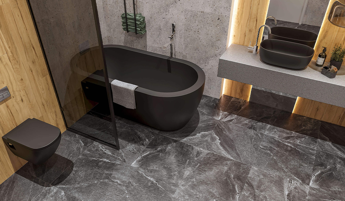 Ванна кімната – це гігієнічне місце, де чистота та стиль йдуть пліч-о-пліч. У цьому просторі, оформленому за допомогою вишуканих матеріалів, кожен елемент і деталь відіграють свою роль у створенні затишної та функціональної атмосфери. На підлозі розгорнувся розкішний керамограніт Golden Tile Terragres Black Rock, що вражає своєю глибинним кольором та витонченим текстурованим ефектом. Цей матеріал не лише додає приміщенню сучасний вигляд, але й забезпечує довговічність і легкість у догляді. Стіна біля ванни облицьована сірим керамогранітом Cersanit Rialto Grey Matt. Його матова поверхня створює спокійну атмосферу, що гармонійно поєднується з темним підлоговим покриттям, додаючи простору витонченості та стриманого стилю. Для всіх інших стін обрано керамограніт Cersanit Aspenwood Beige, що відтворює текстурний малюнок дерева. Цей матеріал привносить тепло та затишок у кімнату, контрастуючи з темними деталями. На тумбі розташовано умивальник Axis 11B.OBOXL.99A.0000B Olib розміром 60 см. Його елегантний вигляд доповнюється змішувачем Grohe BauClassic 31234001, що поєднує класичний дизайн і сучасні технології для зручності користування. На протилежній стороні приміщення, над підвісним унітазом, встановлена кнопка змиву Geberit Delta 50 115.119.46.1 з матовим хромовим покриттям. Її витончений вигляд підкреслює загальну стильову концепцію ванної кімнати, забезпечуючи зручний доступ та функціональність.