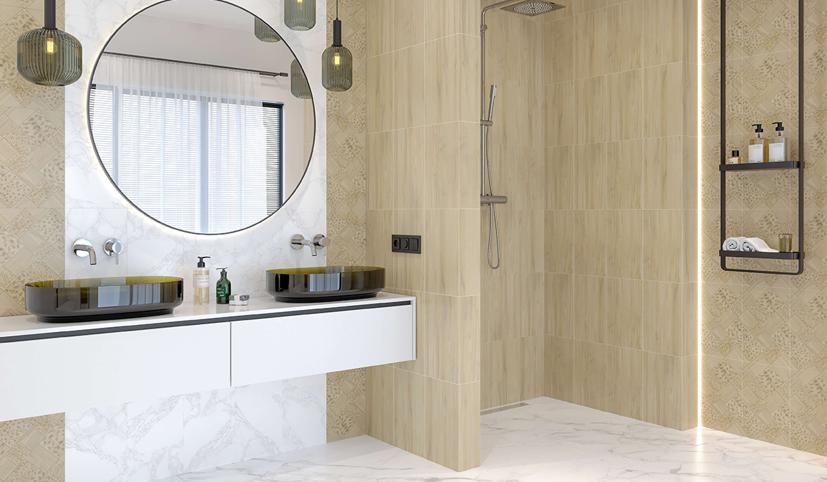 Ванна кімната поєднує в собі натуральні та сучасні елементи, створюючи затишний і стильний простір. Стіни приміщення прикрашені плиткою Golden Tile Honey Wood Patchwork HW1151 (25*40 см) бежевого кольору. Її витончений дизайн з малюнком петчворк додає оригінальності та природної теплоти. Для душового простору обрано плитку Golden Tile Honey Wood HW1061 (25*40 см), що створює гармонію та безперервність в інтер'єрі. Її натуральний відтінок формує відчуття тепла і спокою, роблячи гігієнічну частину місцем для релаксації. Акцентна зона біля підвісної тумби з умивальниками оздоблена плиткою Golden Tile Honey Wood HW0051 White (25*40 см). Вона створює свіжу та чисту частину ванної кімнати як особливу та елегантну. На тумбі встановлені два змішувачі KFA Armatura Moza Chrom 5039-810-00, вмонтовані в стіну, що підкреслюють мінімалістичний стиль та забезпечують максимальну зручність. Над умивальниками висить велике дзеркало Studio Glass Ark Royal Black Iron Mirror (70*70 см) з чорною металевою рамою. Його елегантний дизайн додає інтер'єру сучасного шику та візуально збільшує простір, роблячи приміщення світлішим та просторішим. Підлога кімнати викладена білим керамогранітом Allore Group Avenzo Silver F P Mat Rec (60*120 см). Його гладка поверхня ідеально поєднується з бежевими відтінками, створюючи гармонійний простір.