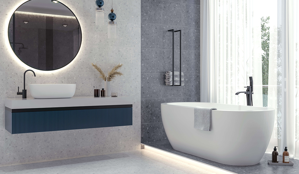 Ванна Golden Tile Joy Terrazzo – зразок елегантного інтер’єру, що поєднує функціональність та естетичний комфорт. Панорамне вікно дозволяє створити зону відпочинку і розмістити ванну так, щоб вона стала не лише місцем щоденної гігієни, а справжнім куточком релаксу після насиченого робочого дня. Решту простору визначає грайливий та ненав’язливий дизайн оздоблювальних матеріалів, а саме плитка для стін Golden Tile Joy Terrazzo JOG161 30*60 см світло-сіра та керамограніт Golden Tile Terragres Joy Terazzo JO2530 Rec 60*60 см сірого кольору, яким вистелена підлога. Прямокутна стільниця є достатньо просторою для зберігання мийних засобів та косметики, а також дозволяє розмістити стильний овальний умивальник Cersanit Moduo 50*36 см. Надійний сучасний змішувач Kroner KRP Edelstahl Klassisch SCH035 чорного кольору ефектно контрастує з білосніжною сантехнікою та вдало гармоніює з темною рамою круглого дзеркала Studio Glass FLETCHER з сенсорним вимикачем та фоновою підсвіткою. Трохи текстилю у вигляді рушників чи халатів базових відтінків – і ванна стане найзатишнішим місцем вашого дому.