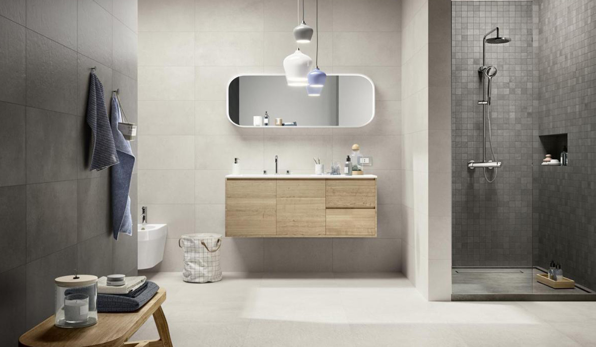 Сучасне рішення для інтер’єру ванної кімнати відображає швидкі темпи життя, де функціональність кожної деталі простору сприяє найкращій організації часу. Монохромність барв та відтінків, простота форм та матеріалів поєднуються у досконалу композицію, де ранкові ритуали додають енергії на щоденні справи, а вечірні – дають можливість зняти втому дня. Оздоблення стін у кімнаті плиткою Golden Tile Kendal графіт У1Ф659 30,7*60,7 та керамогранітом Intercerama Superwhite 19061/L Rec 120*60 см білого кольору врівноважує та заспокоює. Світла підлога, викладена керамогранітом Casa Ceramica Super White Polished 60*60 см, згладжує суворий настрій сірого і додає йому легкості та елегантності. Особливої фактурності та візуального пожвавлення додає мозаїка Cersanit Highbrook Grey Mosaic 29,8*29,8 см сіра, що разом з душовою системою Rubineta 625125 хром оформлює зручну зону для купання. Біде підвісне Jaquar SOLO SLS-WHT-6153 із білосніжної сантехнічної кераміки з прихованим монтажем створює комфортні умови для прибирання кімнати. Дзеркало Aqua Rodos Callisto sensor з підсвіткою 115*70 см є центральним атрибутом, що створює затишок, спокійну атмосферу та, окрім свого практичного значення, збагачує оздоблення кімнати.