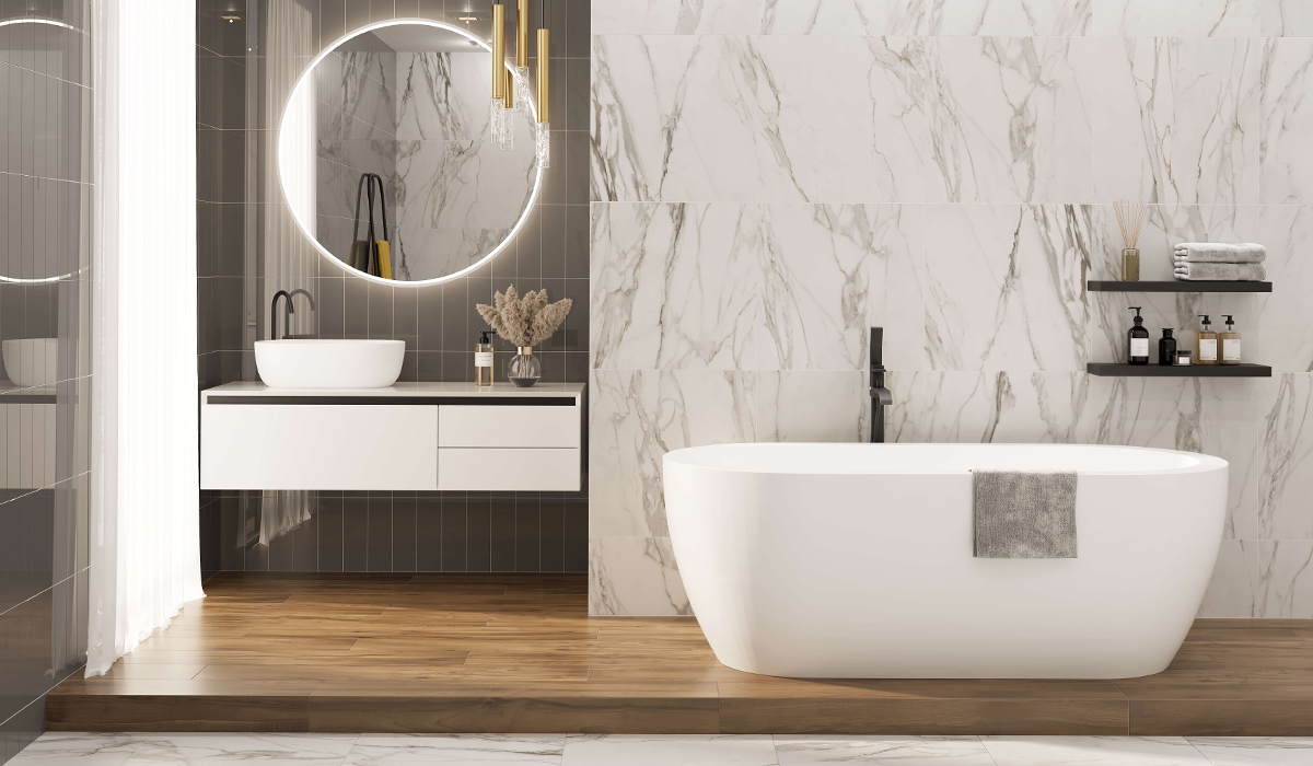 Ця ванна кімната вражає своєю елегантністю та витонченістю, втілюючи ідеальне поєднання сучасності та функціональності. Стильний інтер'єр виконаний з використанням керамограніту Golden Tile Terragres Marmo Verona MV09П0 Rec розміром 60x120 см у білому кольорі на стінах, який створює відчуття простору та чистоти. Його мармуровий візерунок робить вбиральню справжньою оазою спокою. На підлозі використано квадратний керамограніт Golden Tile Terragres Marmo Verona MV0520 Rec. Він чудово доповнює стіни, створюючи гармонійний та цілісний образ приміщення, підкреслюючи просторість. Особливого шарму додає п'єдестал у зоні з ванною та умивальником, оздоблений керамогранітом Golden Tile Terragres Dakota DT7120 з дерев'яним малюнком. Він створює контраст з білими поверхнями та надає кімнаті неповторного характеру. На підвісній тумбі встановлено умивальник Jaguar JDS JDS-WHT-25909, який доповнюється стильним чорним змішувачем Kuchinox Dima BQD 768D. Цей ансамбль формує елегантний вигляд, а також забезпечує зручність у користуванні. Над цією зоною розміщене дзеркало Studio Glass MARTEL розміром 70x70 см з сенсорним вимикачем, що додає функціональності та комфорту. Його форма відмінно вписується в загальний дизайн, надаючи приміщенню завершеного вигляду.