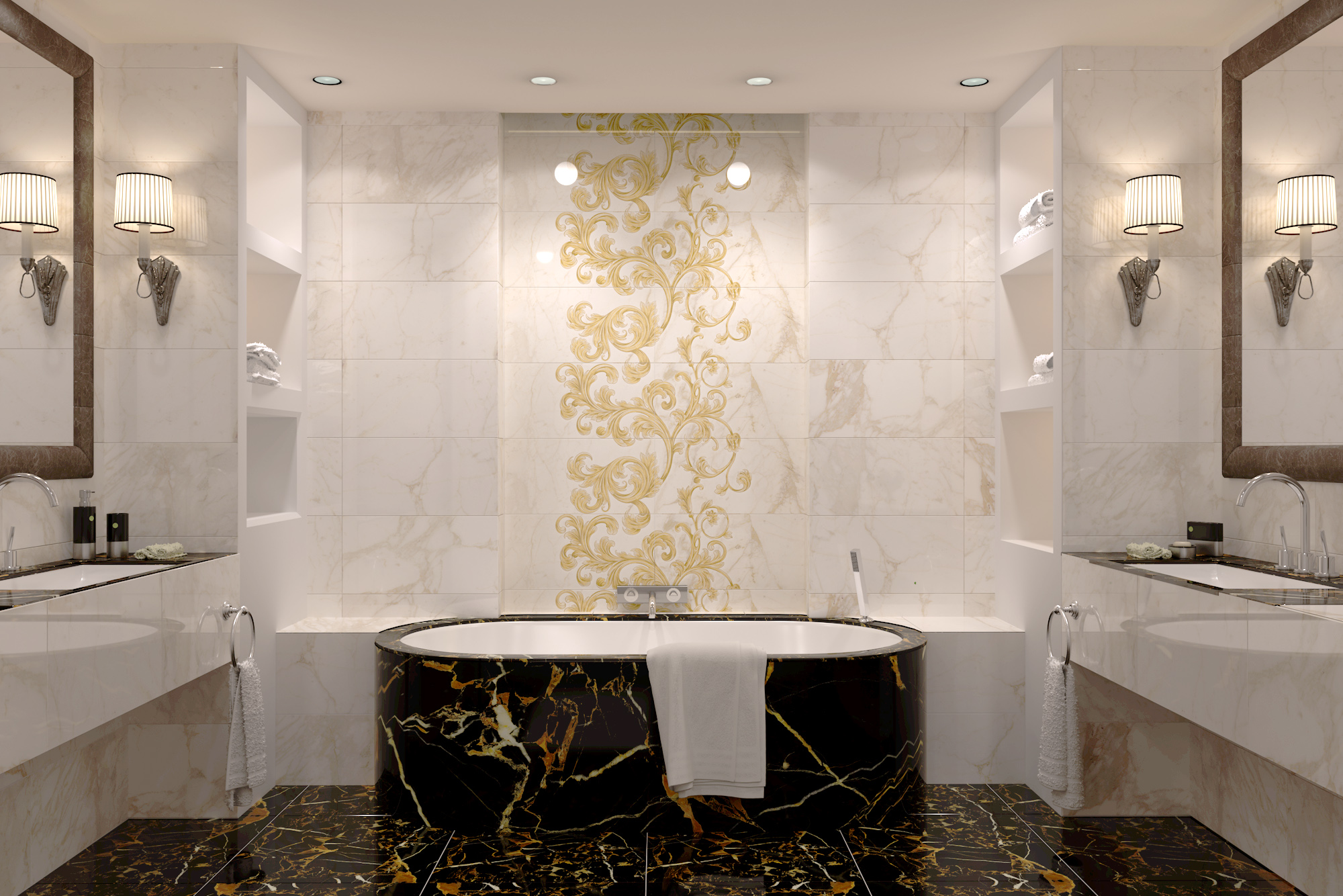 Увійшовши у ванну кімнату Golden Tile Saint Laurent, ви відчуєте себе, ніби у справжньому палаці розкоші. Кожна деталь, починаючи з облицювання і закінчуючи меблями, здатна зачарувати і залишити незабутнє враження. Відразу привертає увагу незвичайний малюнок, створений за допомогою плитки Golden Tile Saint Laurent білий декор №1, Golden Tile Saint Laurent білий декор №2, Golden Tile Saint Laurent білий декор №3 та Golden Tile Saint Laurent білий декор №4. Спільна картина, як мозаїка, відтворює атмосферу вишуканості, де кожен елемент має своє значення в створенні загального гармонійного образу. Продовжуює сміливий дизайн, плитка Golden Tile Saint Laurent біла розміром 30x60, що використовується на стінах всієї ванної кімнати. Її бездоганний білий відтінок надає приміщенню світлість і чистоту, створюючи враження простору та елегантності. В цій атмосфері не можна не помітити плитку Golden Tile Terragres Saint Laurent чорний розміром 60,7x60,7, розміщену на підлозі. Її глибокий чорний колір створює захопливий контраст зі світлою плиткою на стінах, додавши простору сучасності.
