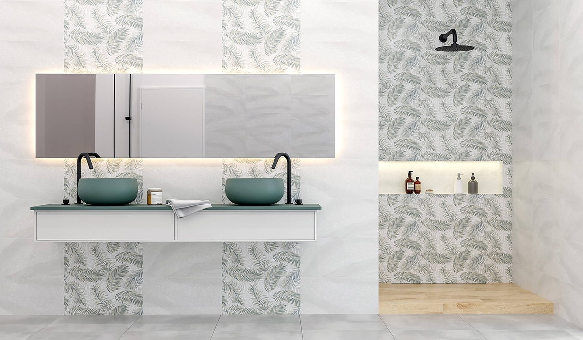 Ванна кімната, оформлена в стилі сучасного мінімалізму, вражає своєю елегантністю та витонченістю. Головним акцентом є декоративна плитка Golden Tile Serenita Leaf SR2151 Satin Gray, що прикрашає стіни. Її колір і рослинний мотив надають приміщенню свіжості та природної краси. Вона прекрасно поєднується з Golden Tile Serenita SR2051 Satin Gray, створюючи гармонійний та цілісний образ. Підлога приміщення оздоблена керамогранітом Intercerama Blend 174071 РЕКТ світло-сірого кольору, яка додає світла та візуальної чистоти. Для душової кабіни обрано світло- бежевий керамограніт Allore Group Aurora Light Beige F PR R Mat 1. Такий відтінок надає тепла та затишку, створюючи приємний контраст з мінімалістичними стінами. Душова система Vidan IN-H11009 BK в чорному кольорі формує сучасний вигляд та стильний акцент, підкреслюючи загальну концепцію простору. Її лаконічний дизайн ідеально поєднується з іншими елементами ванної. Для створення комфорту та затишку використовується білий махровий рушник Home Line 124796 (50*90 см), що розташований на підвісній тумбі. Його м’яка текстура і білосніжний колір додають інтер'єру ніжності та чистоти.