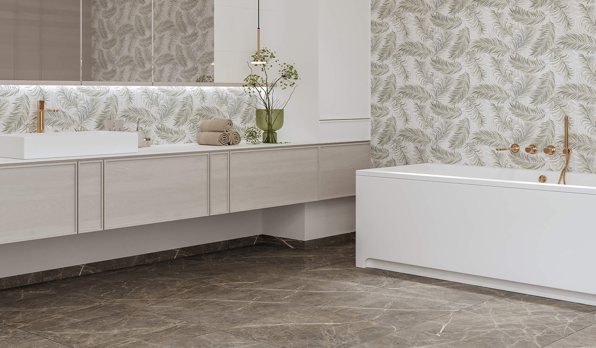 Ця ванна кімната втілює сучасний стиль із нотками природного тепла та затишку. Стіни прикрашені елегантною плиткою Golden Tile Serenita Leaf SR2151 Satin Gray (30*60 см) з рослинним мотивом, що надає приміщенню легкості та натуральності. Сірий колір плитки створює спокійний та гармонійний фон для всього інтер'єру. Підлога приміщення вкрита керамогранітом Golden Tile Terragres Stone Roots коричневого кольору. Використання різних розмірів керамограніту - SO79П0 Rec (60*120 см) та SO7520 Rec (60*60 см) - додає динаміки та візуального інтересу, створюючи ефект справжньої кам'яної підлоги. А коричневий відтінок додає тепла та затишку, створюючи приємний контраст зі стінами. На стільниці встановлено стильний умивальник Laveo KVADRATO VUK_6247, що має лаконічний дизайн і забезпечує максимальну функціональність. Поруч з ним лежать три м'які махрові рушники Soho Luna Beige, які додають простору ніжності та комфорту. Над тумбою розміщено мінімалістичний підвісний світильник Ultralight TRL543 51517 (6W, 4000К) чорного кольору. Його сучасний дизайн ідеально доповнює загальну концепцію інтер'єру, створюючи м'яке, розсіяне світло, яке підкреслює всі елементи декору та надає ванній кімнаті затишного освітлення.