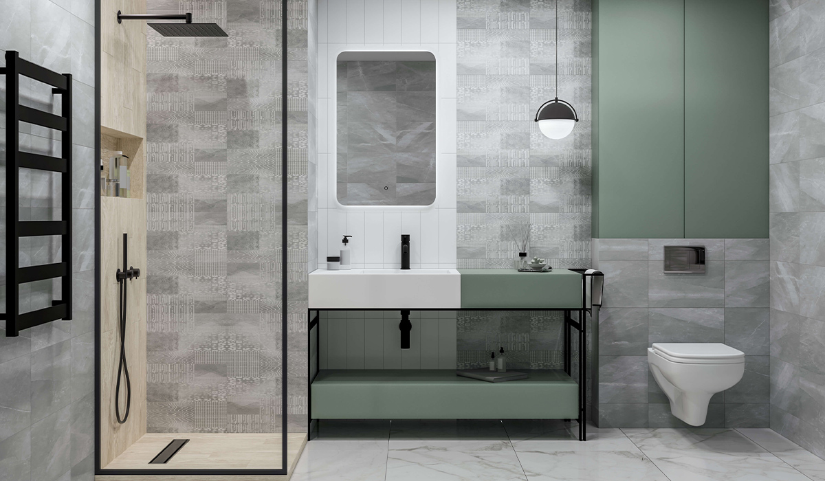 Ванна кімната – це простір, де поєднуються функціональність та естетика, створюючи ідеальне місце для щоденного догляду та відпочинку. Завдяки ретельно підібраним матеріалам та сучасним рішенням, кожен елемент цієї кімнати сприяє створенню комфортної стильної атмосфери. Стіни кімнати оздоблені двома видами плитки з колекції Golden Tile Stone Story. Сіра плитка SY2051 25*40 см додає простору стриманості та елегантності, а її варіант у стилі петчворк SY2151 тієї ж розмірності вносить нотки креативності та динаміки. Разом вони створюють гармонійний контраст, підкреслюючи сучасний дизайн приміщення. Зона біля умивальника виділена білою плиткою Golden Tile The Wall Plane 6L0111 з сатиновим покриттям. Її чистота та блиск чудово поєднуються зі змішувачем KFA Armatura Moza 5032-815-81 у чорному кольорі, створюючи стильний і функціональний акцент. Душова кабіна оформлена керамогранітом Allore Group Rovere Ivory F PR R Mat 1 15*90 см у відтінку айворі. Цей матеріал використано як для стін, так і для підлоги кабіни, що забезпечує єдність стилю та неперевершену естетику. На підлозі приміщення розташовано керамограніт Inspiro Avenzo Gold PY126931 розміром 60*120 см у білому кольорі. Його елегантний вигляд ідеально доповнює загальний дизайн простору, додаючи нотку витонченості.