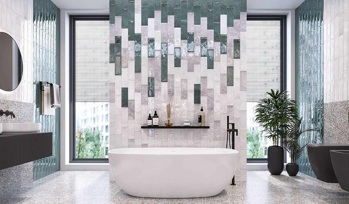 Водна стихія у барвах стін великої ванної кімнати оживає блисками, хвилями й півтонами та наповнює життєдайною енергією простір. Мозаїчна структура керамограніту Intercerama Harley 86072 Rec 60*60 см темно-сірого відтінку на підлозі та нижньому оздобленні стін є універсальним покриттям, що легко поєднується з іншими структурами, формами та кольорами. Плитка для стін Golden Tile Vintage VG4061 10*30 см зелена в динамічному ансамблі світлих кольорів створює ефект водоспаду в центральній частині інтер’єру. На бокових стінах вона застигає в льодяній грації й додає елегантного блиску. На такому фоні стильно виглядають вазони у темних горщиках, біде підвісне Galassia Dream GLS-7313NEMT nero matt та унітаз підвісний Galassia Dream GLS-7317NEMT matte чорного кольору. Кругле дзеркало Studio Glass Ark Royal Black Iron Mirror 70*70 см на білій поверхні додає м’яких ліній та чітких зображень. Широка ребриста полиця підкреслює елегантність білого умивальника Jaquar Laguna LAS-WHT-91905 60*38 см з ефектним змішувачем для умивальника KFA Armatura Moza Black 5039-810-81. Панорамні вікна створюють особливу атмосферу відкритості та природності.