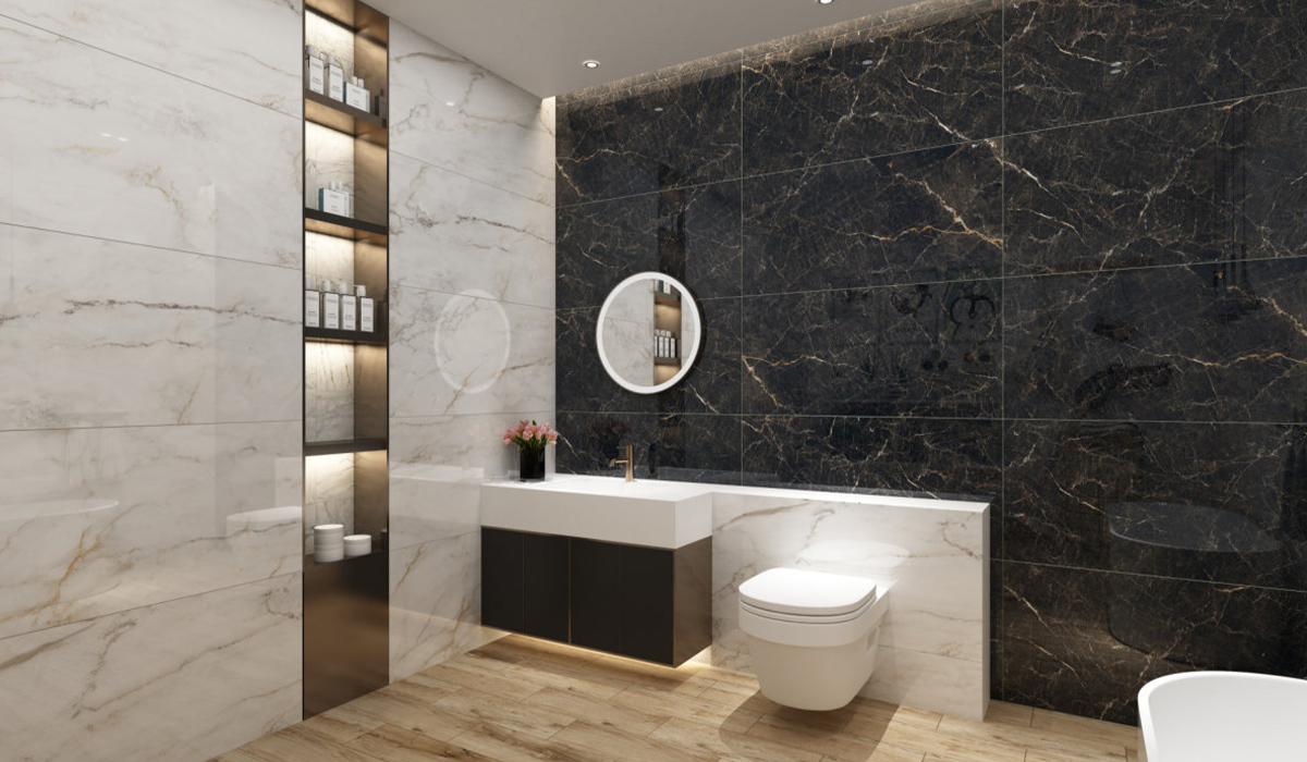 Ця ванна кімната втілює сучасний дизайн із використанням контрастних матеріалів, створюючи вишуканий простір. Стіни оздоблені керамогранітом двох видів: Intercerama Mauree 27082/KL Rec у чорному та Атем Calacatta Gold WM у білому кольорі. Темна плитка додає глибини та драматичності інтер'єру, а біла з мармуровим візерунком надає простору світлості та вишуканості. Комбінація цих типів створює візуально привабливу картину, що підкреслює стильний характер приміщення. Підлога оздоблена керамогранітом Cersanit Wood Sensewood Beige з малюнком під дерево. Цей матеріал вносить тепло та природність, формуючи затишну атмосферу, яка контрастує з гладкими поверхнями стін. На стелі вмонтовані врізні світильники LED Lebron L-DR-1841 потужністю 18W і температурою світла 4100K. Вони забезпечують рівномірне та яскраве освітлення, створюючи комфортні умови для гігієнічних процедур. В куті кімнати розташована підвісна тумба з умивальником, де встановлений змішувач Globus Lux Alpen SBT1-101. Він відрізняється своїм витонченим дизайном, забезпечуючи зручність у користуванні. Над ним розміщено дзеркало Aqua Rodos Омега RLine з підсвіткою розміром 60 см, яке додає приміщенню функціональності та естетичної привабливості. Підсвітка створює м'яке, приємне світло, що ідеально підходить для догляду за собою.