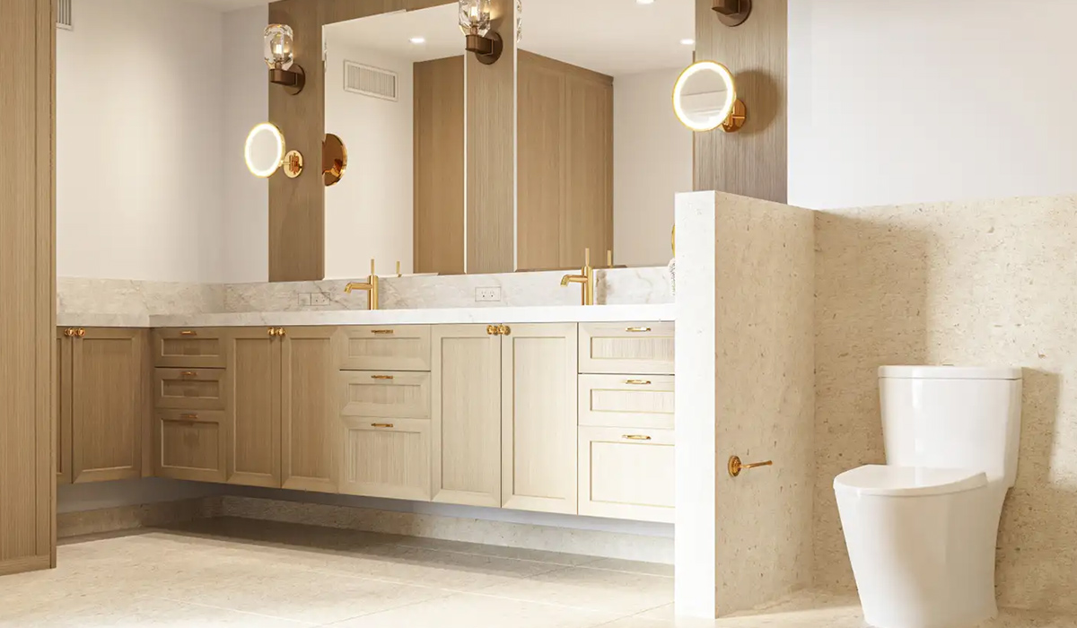 Класична елегантність бежевого кольору є універсальним рішенням для ванної кімнати, адже його естетика не належить до швидкоплинних тенденцій і завжди залишатиметься актуальною. Оздоблення стін та підлоги керамогранітом Intercerama Reliable 03021 60*60 світло-бежевого відтінку створює спокійну і привабливу базу для інших елементів інтер’єру. Дерев’яна структура фасадів додає природної вишуканості та гармонії світлих відтінків. Витончені позолочені ручки підкреслюють красу поверхонь та додають особливої розкоші й шарму, як і змішувач для умивальника Laveo Pola BAP_G22D золото. Просторі дзеркала Арена 80*60 см єврокромка разом з оригінальним світловим рішенням створюють казкову багатовимірність, ілюзорну загадковість та динамічну естетику простору. Химерні контури вишуканих бра Sirius GLB-23746-1 GD+BK нагадують магічні ліхтарі, що можуть здійснювати бажання. Біла поверхня унітаза Cersanit Crea Clean On 010/020 з овальною кришкою із дюропласту lift без бачка, умивальники та білосніжні стіни роблять інтер’єр світлішим та дарують легку атмосферу невимушеності та традиційності. Така ванна кімната додає щоденної впевненості та внутрішньої гармонії навіть у нелегкі моменти нашого життя.
