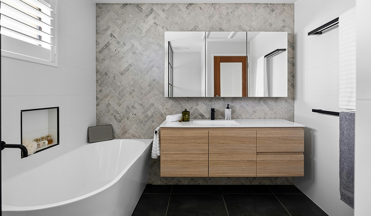 Універсальний дует чорного та білого кольорів створює відмінну композицію у ванній кімнаті, поєднуючи легкість світлих поверхонь та чіткість темних ліній. Підлога, оздоблена керамогранітом Intercerama Schwarz 132082 Rec 60*60 см чорним, вимальовує виразну сміливість і глибокий фон інтер’єру. Невагому білизну і чистоту демонструє плитка Golden Tile Сатин біла НЗ0251 30х60 на стінах, візуально розширюючи простір. Асиметрична модель для пристінного монтажу ванни кутової акрилової правої Besco Avita 170*75 без ніжок доповнює стиль і комфорт кімнати бездоганною естетикою та функціональністю. Темні акценти розставляє змішувач для умивальника Laveo Kvadrato BLQ_722D чорний та тримач для рушника Kroner KRP Edelstahl Kubus-SCH3901, що ефектно контрастують з білизною санфарфору. М’якість рушників махрових Home Line 181040 500 г/м2 70*140 см сірих збагачує інтер’єр, додаючи тепла та домашнього затишку.