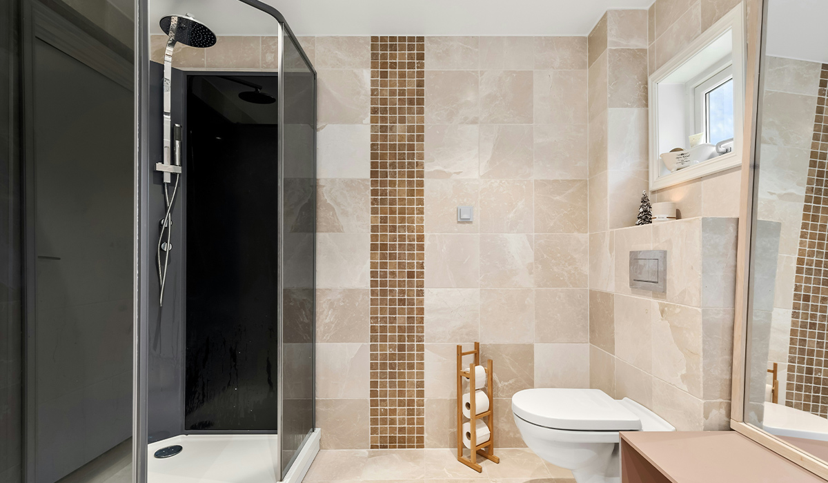Дизайн ванної кімнати в бежевому кольорі залишається традиційним вибором вже протягом тривалого часу. Такий інтер’єр не набридає, не обтяжує та не втомлює, а його теплота і стриманість підкреслюють практичність і функціональність простору. Отже, для оздоблення стін сміливо обираємо керамограніт Opoczno Stone Flower Beige 42*42 та додаємо вертикальну смугу мозаїки Intercerama Tuff М02023 29,8*29,8 см мікс. Таке поєднання збалансовує монохромність поверхонь, додаючи цікавого акценту і динаміки. В кутку традиційно розміщуємо прозору душову кабіну напівкруглу New Trendy K-0515 R55 Suvia 90*90*185 см з гартованим склом, де купання буде приємною процедурою завдяки великим розмірам і естетичному дизайну виробу. Унітаз підвісний Geberit Selnova TurboFlush 503.083.00.1 з сидінням та горизонтальним зливом – це не лише щоденний комфорт, але й відмінна чистота та гігієна ванної кімнати. Хромована кнопка змиву Geberit Delta 30 115.137.46.1 матова забезпечує надійну роботу протягом багатьох років, виконуючи ще й естетичну функцію інтер’єру. Дерев’яний тримач туалетного паперу буде відмінним доповненням простору і практичним рішенням для зберігання. Лаконічний дизайн кімнати зберігає відмінні щоденні зручності та естетичну завершеність композиції.