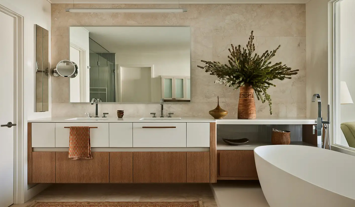 Створення затишку ванної кімнати починається із планування функціональних зон, що забезпечать комфорт на кожен день, а сучасне оздоблення дозволяє проявити власні смаки та вподобання. У сучасній ванній естетично виглядає композиція підлоги з різних видів оздоблення, в даному інтер’єрі – керамограніту Cersanit Henley Beige 29,8*59,8 1с та керамограніту Paradyz Elegantstone Bianco Polpoler 59,8*59,8 см 8 мм бежевого на підлозі під ванною. Стіна оздоблена в такому ж кольорі керамогранітом Intercerama Umber 135022 60*120 см, вона ефектно поєднується з білими елементами та коричневими фасадами меблів. Стильні умивальники Jaquar Continental CNS-WHT-701 48*36,5 см на білій стільниці створюють зручності для двох осіб одночасно, а просторе дзеркало Studio Glass Buffalo 80*60 см збільшує простір. Ліворуч розміщене дзеркало косметичне Arino 49348 LED для підвищеного комфорту при вдяганні лінз, голінні чи нанесенні макіяжу. Чудовим доповненням інтер’єру буде рослинний букет, що вносить ноти свіжості та природності у стриманий стиль кімнати.